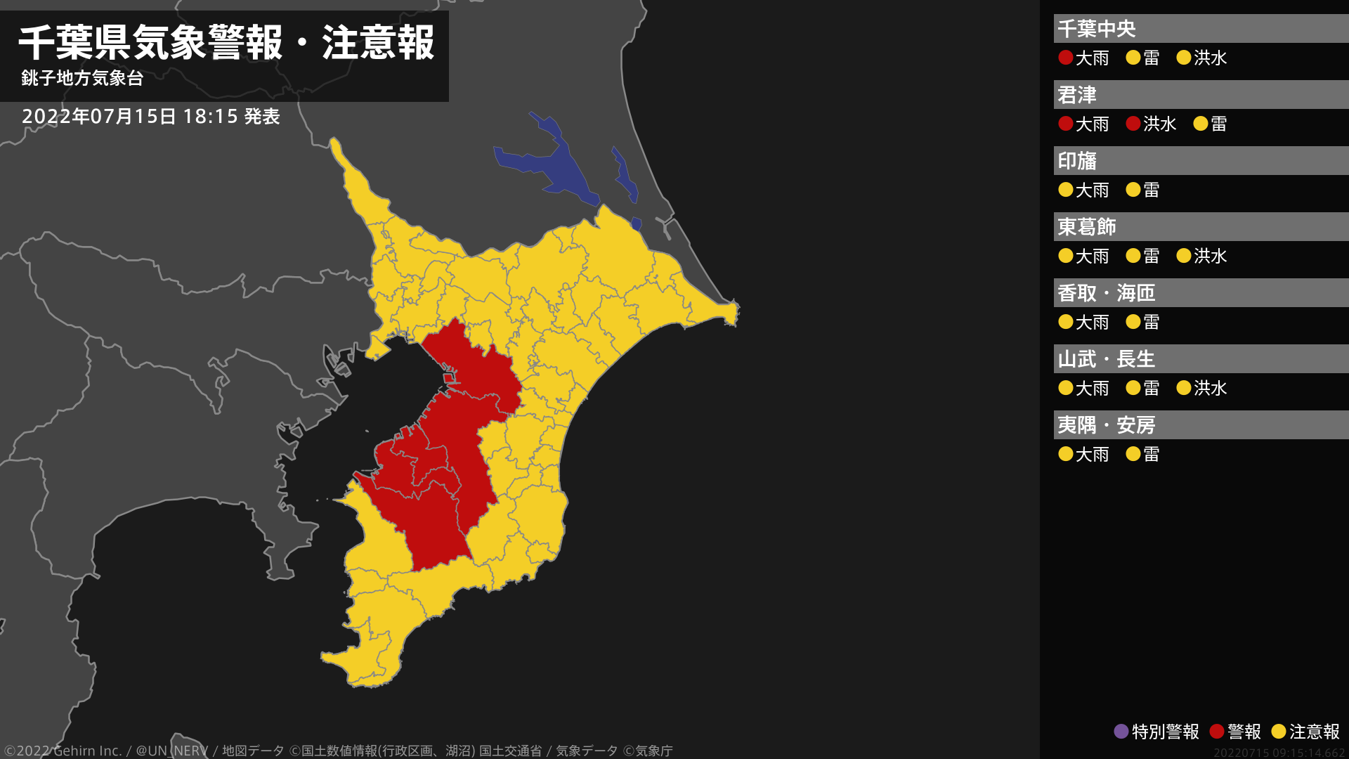 【千葉県 気象警報・注意報 2022年07月15日 18:15】北西部、南部では、15日夜遅くまで土砂災害や低い土地の浸水に警戒してください。南部では、15日夜遅くまで河川の増水に警戒してください。#気象警報注意報 #千葉県