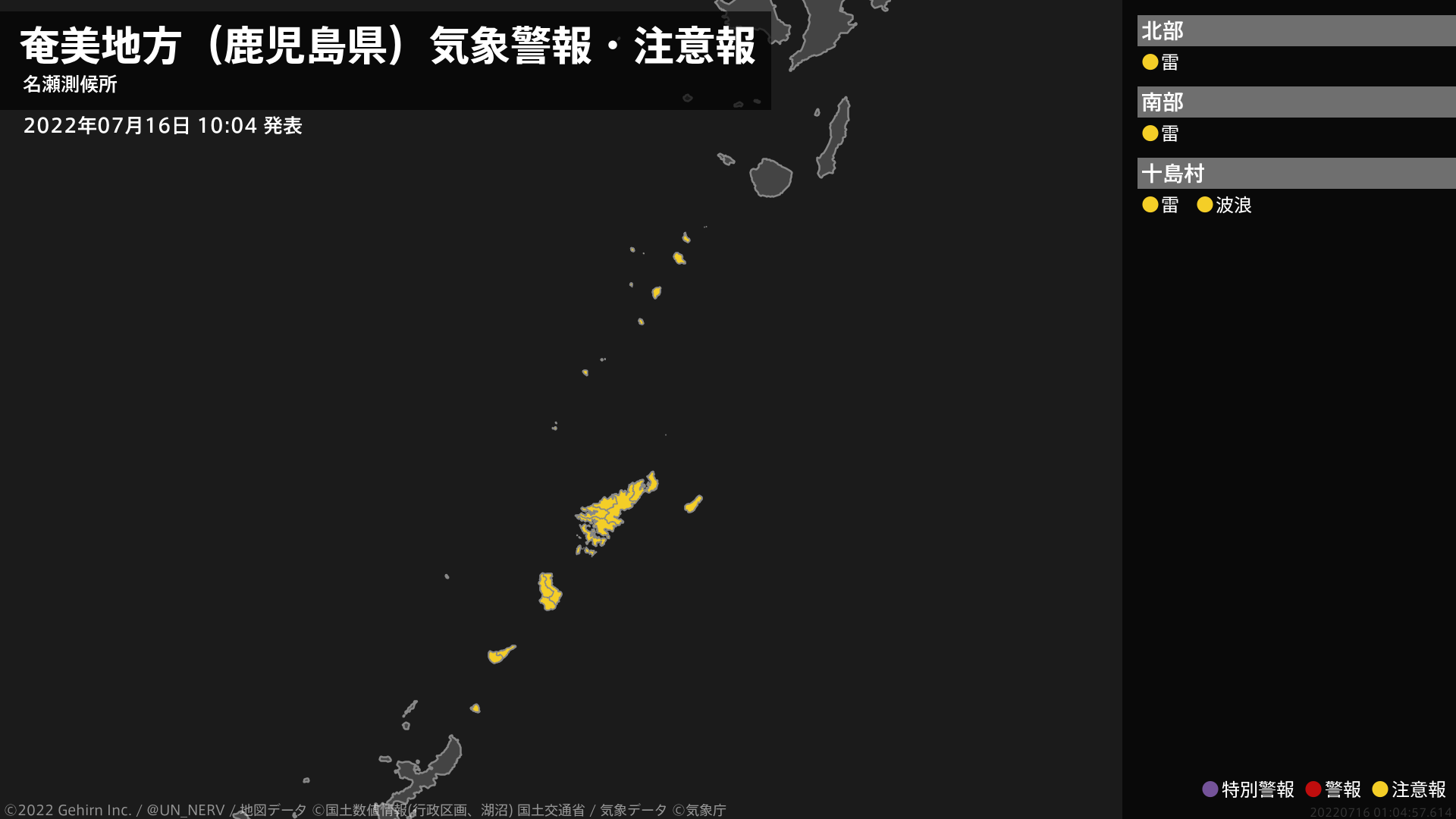 【奄美地方(鹿児島県) 気象警報・注意報 2022年07月16日 10:04】奄美地方では、高波や竜巻などの激しい突風、急な強い雨、落雷に注意してください。#気象警報注意報 #奄美地方