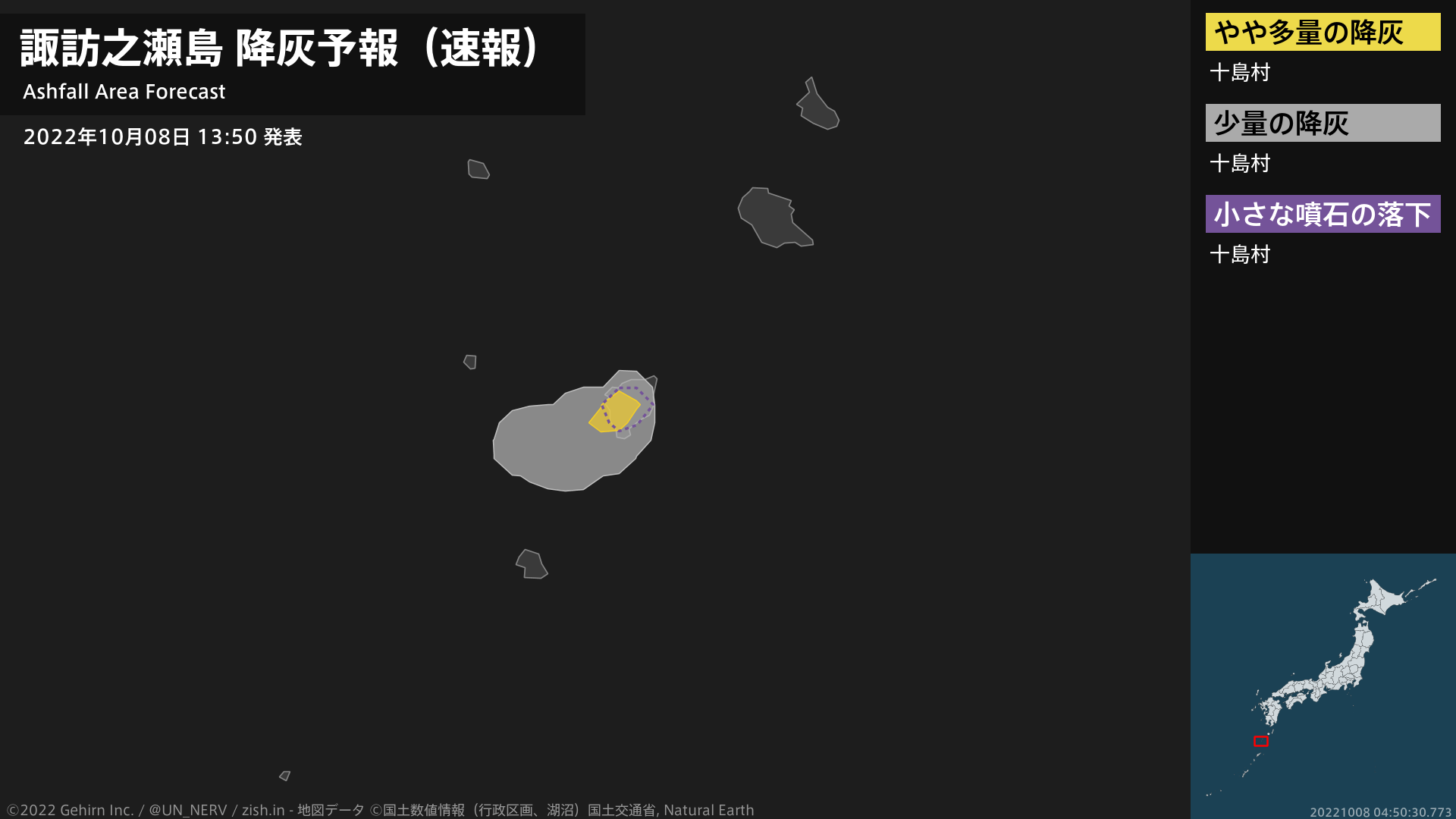 【諏訪之瀬島 降灰予報(速報)】1時間以内に十島村ではやや多量の降灰があり、降灰は鹿児島県十島村まで予想されます。また、火口から南西方向およそ1kmまでの範囲では、小さな噴石が風に流されて降るおそれがあります。#降灰予報(速報)