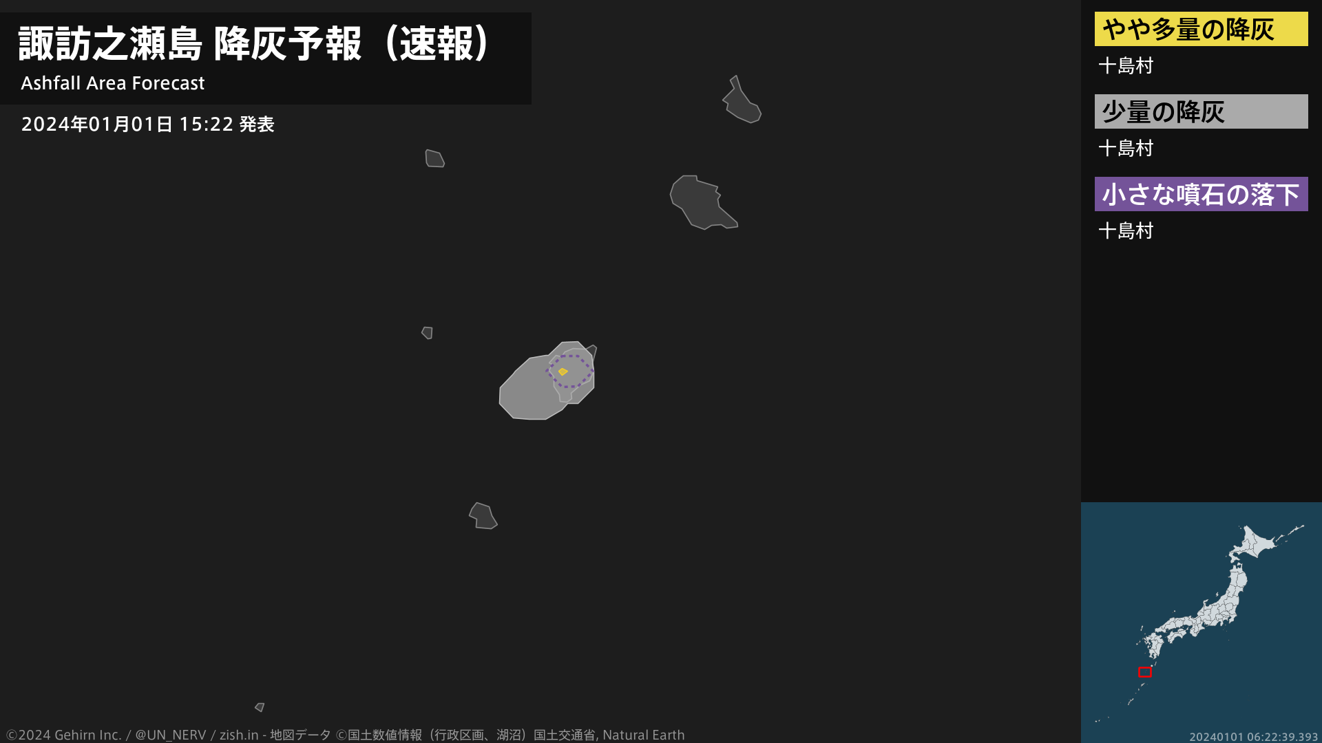 【諏訪之瀬島 噴火に関する火山観測報 2024年01月01日 15:21】01日 15時12分頃、諏訪之瀬島(御岳火口)で噴火がありました。噴煙高度は火口上1600m、噴煙の流向は直上です。#火山 #奄美地方
