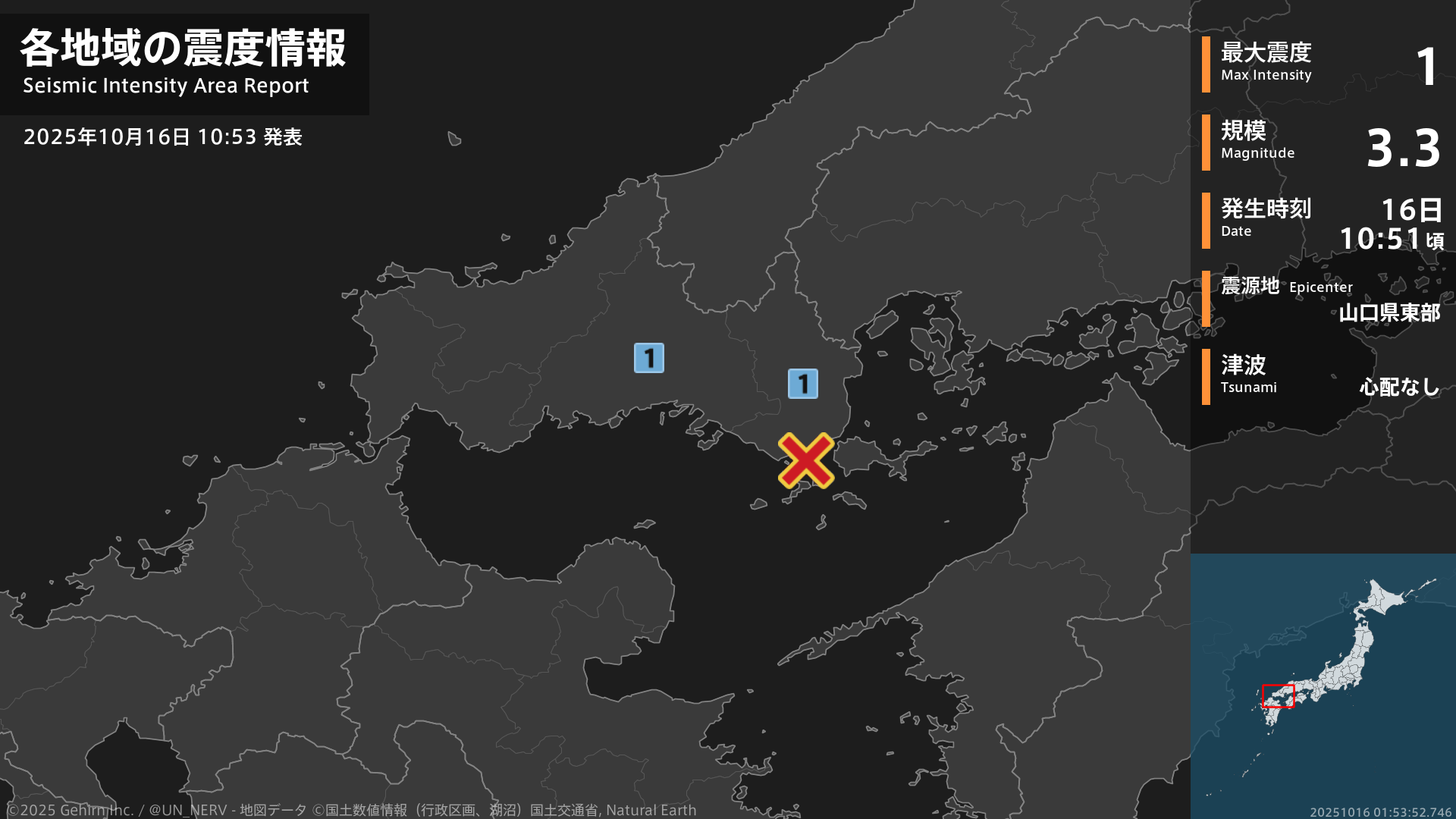 【地震情報 2025年10月16日】10時51分頃、山口県東部を震源とする地震がありました。震源の深さは約60km、地震の規模はM3.3、最大震度1を山口県で観測しています。この地震による津波の心配はありません。#地震 #山口県