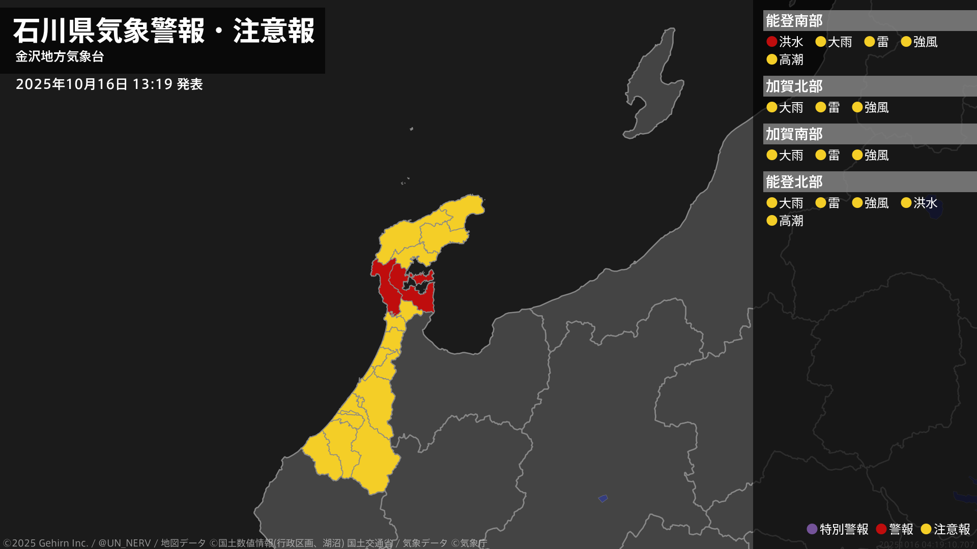 【石川県 気象警報・注意報 2025年10月16日 13:19】能登では、16日夜のはじめ頃まで河川の増水に警戒してください。#気象警報注意報 #石川県