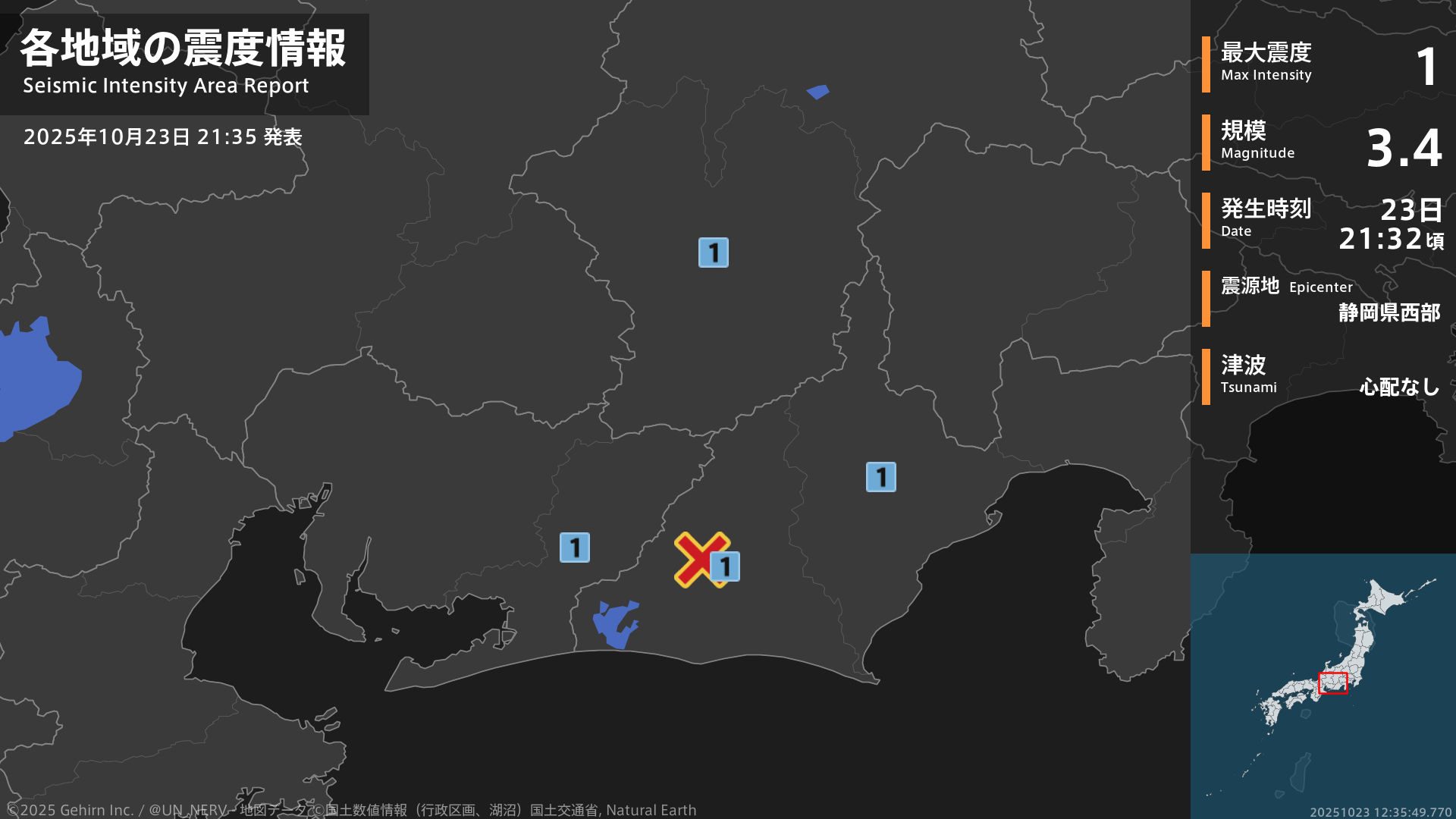 【地震情報 2025年10月23日】21時32分頃、静岡県西部を震源とする地震がありました。震源の深さは約20km、地震の規模はM3.4、最大震度1を長野県、静岡県、愛知県で観測しています。この地震による津波の心配はありません。#地震 #長野県 #静岡県 #愛知県