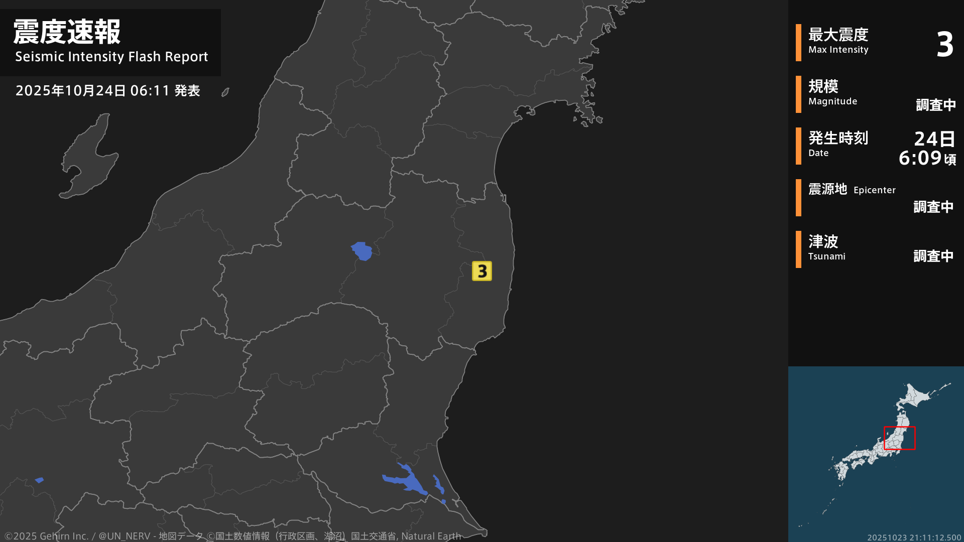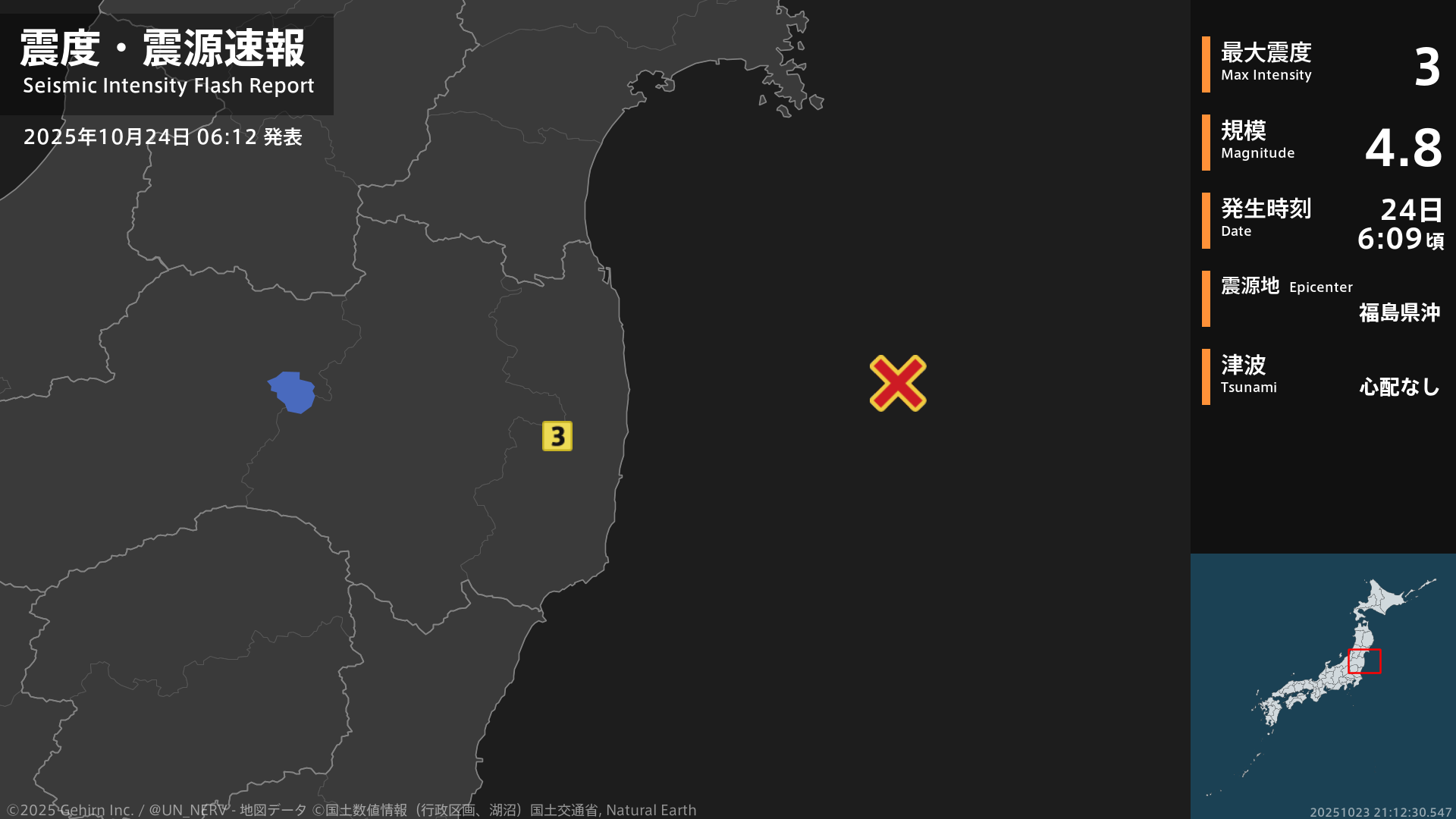 6時9分頃、福島県沖を震源とする地震がありました。地震の規模はM4.7程度、最大震度3程度と推定されています。この情報は気象庁の予報に基づく推定です。情報は誤差を含む場合があります。