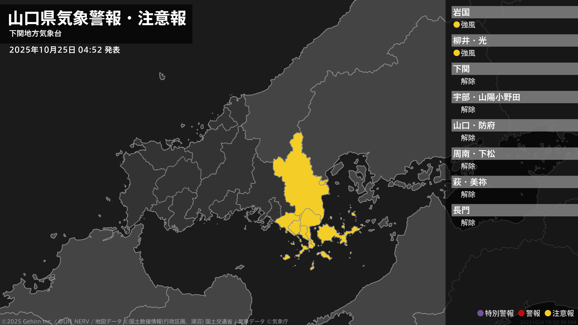 【山口県 気象警報・注意報 2025年10月25日 04:52】東部では、25日昼前まで強風に注意してください。#気象警報注意報 #山口県