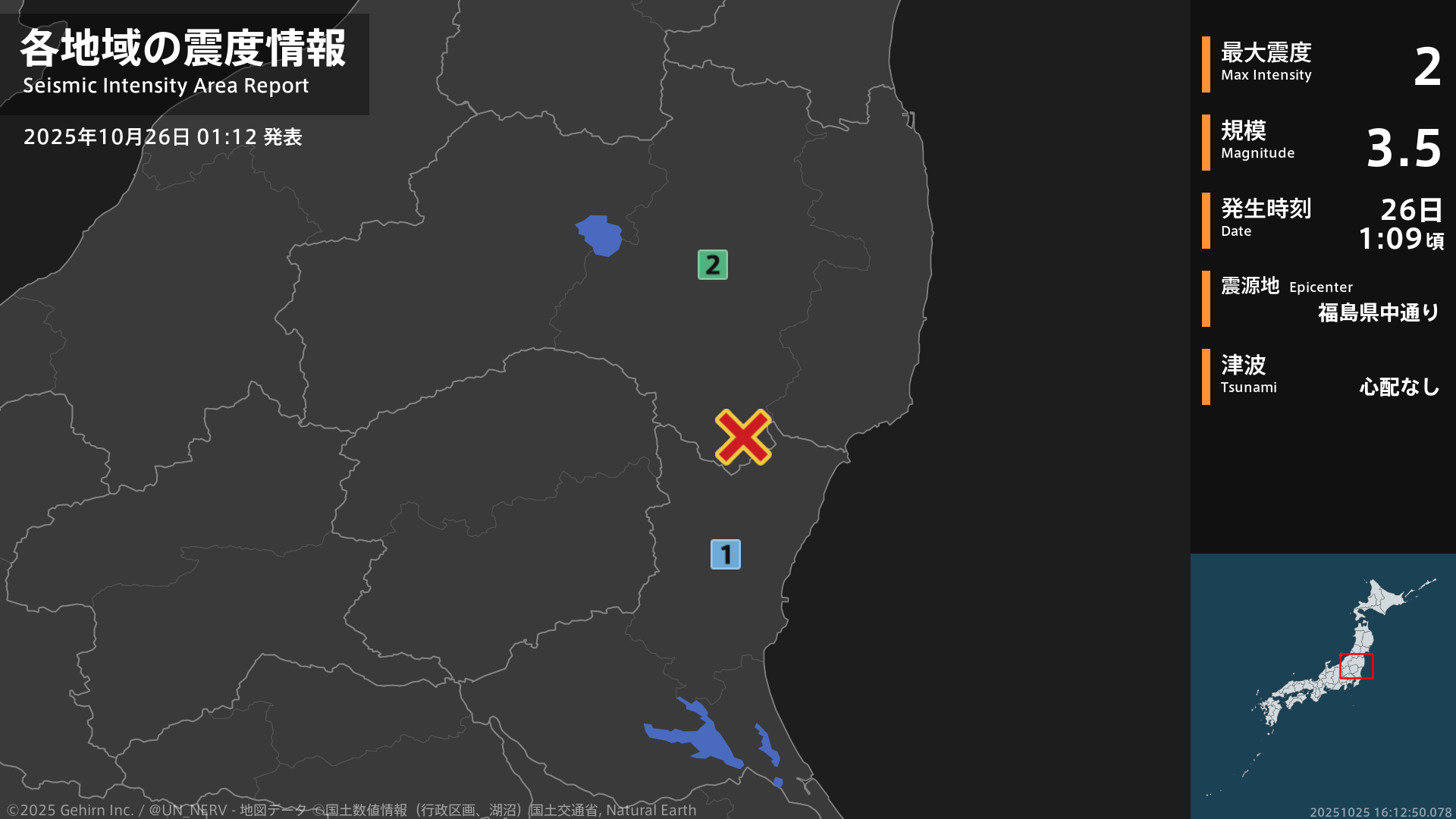 【地震情報 2025年10月26日】1時9分頃、福島県中通りを震源とする地震がありました。震源の深さは約10km、地震の規模はM3.5、最大震度2を福島県で観測しています。この地震による津波の心配はありません。#地震 #福島県 #茨城県