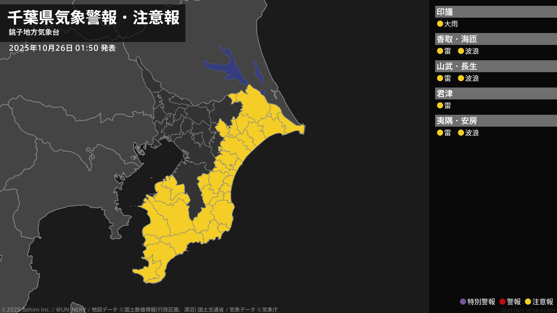 【千葉県 気象警報・注意報 2025年10月26日 01:50】北西部では、低い土地の浸水に注意してください。北東部、南部では、高波や落雷に注意してください。#気象警報注意報 #千葉県