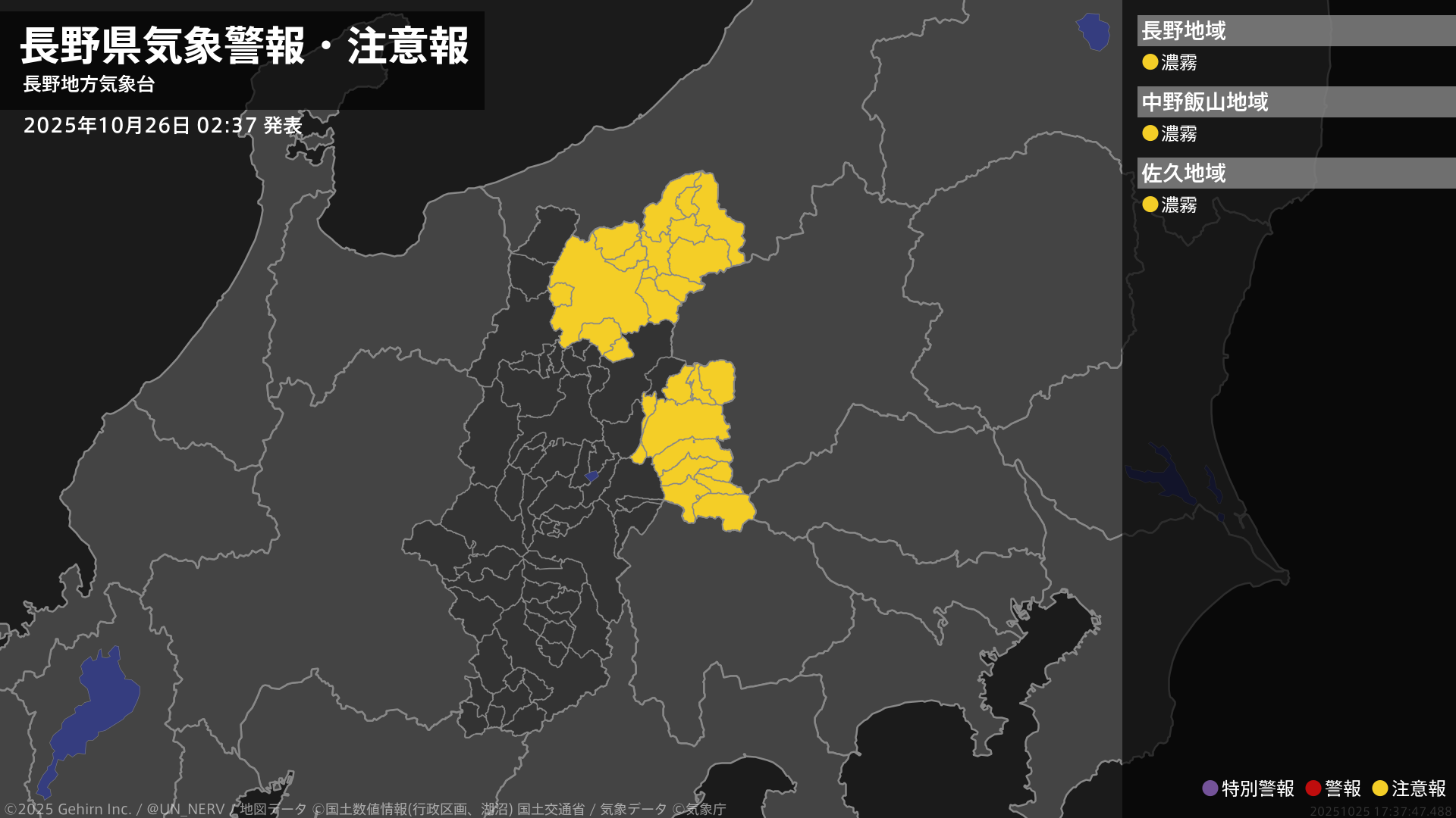 【長野県 気象警報・注意報 2025年10月26日 02:37】北部、中部では、26日昼前まで濃霧による視程障害に注意してください。#気象警報注意報 #長野県