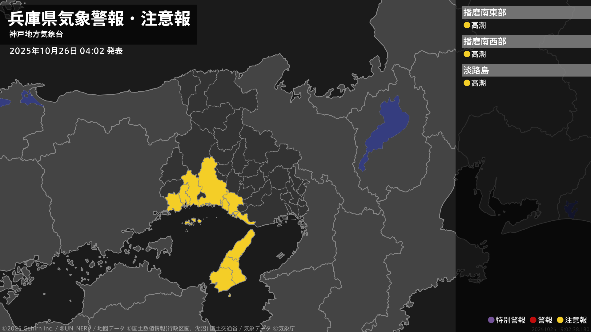 【兵庫県 気象警報・注意報 2025年10月26日 04:02】南部では、26日昼過ぎから26日夕方まで高潮に注意してください。#気象警報注意報 #兵庫県
