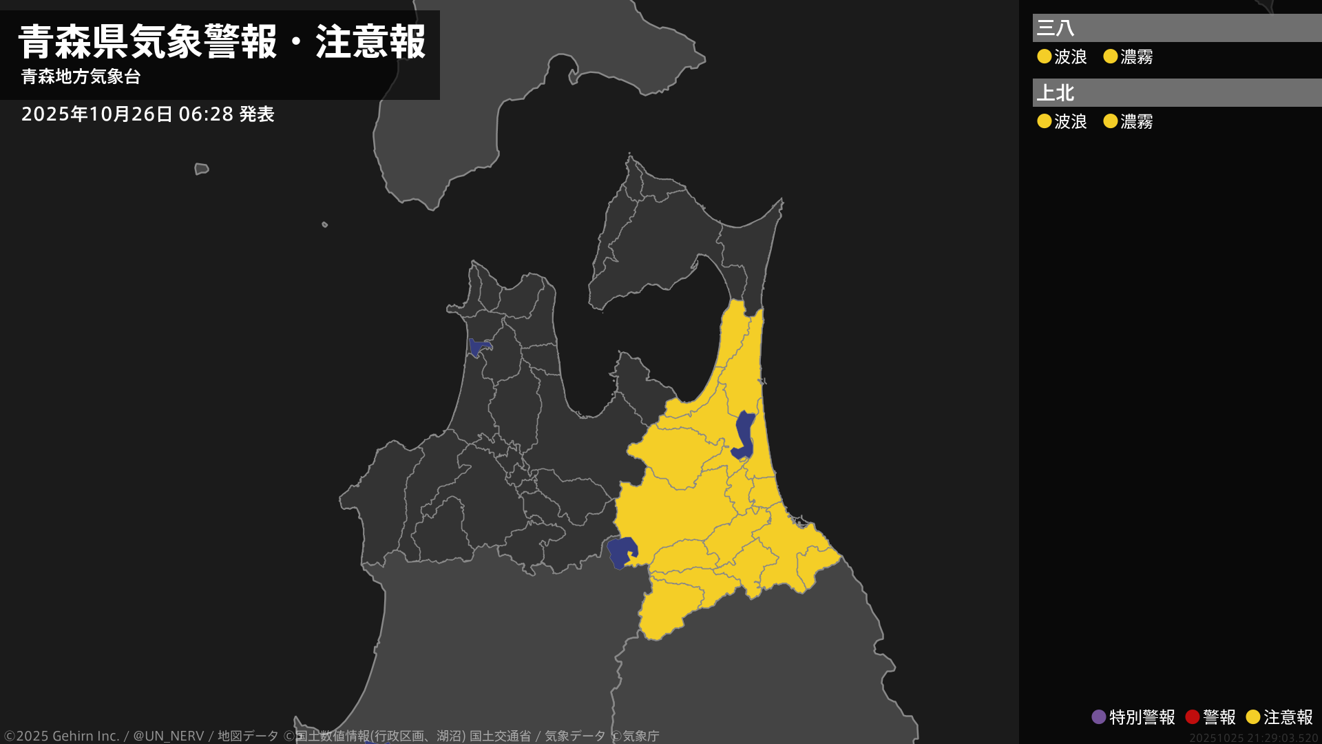 【青森県 気象警報・注意報 2025年10月26日 06:29】三八上北では、26日昼過ぎから26日夜のはじめ頃まで高波に、26日昼前まで濃霧による視程障害に注意してください。#気象警報注意報 #青森県