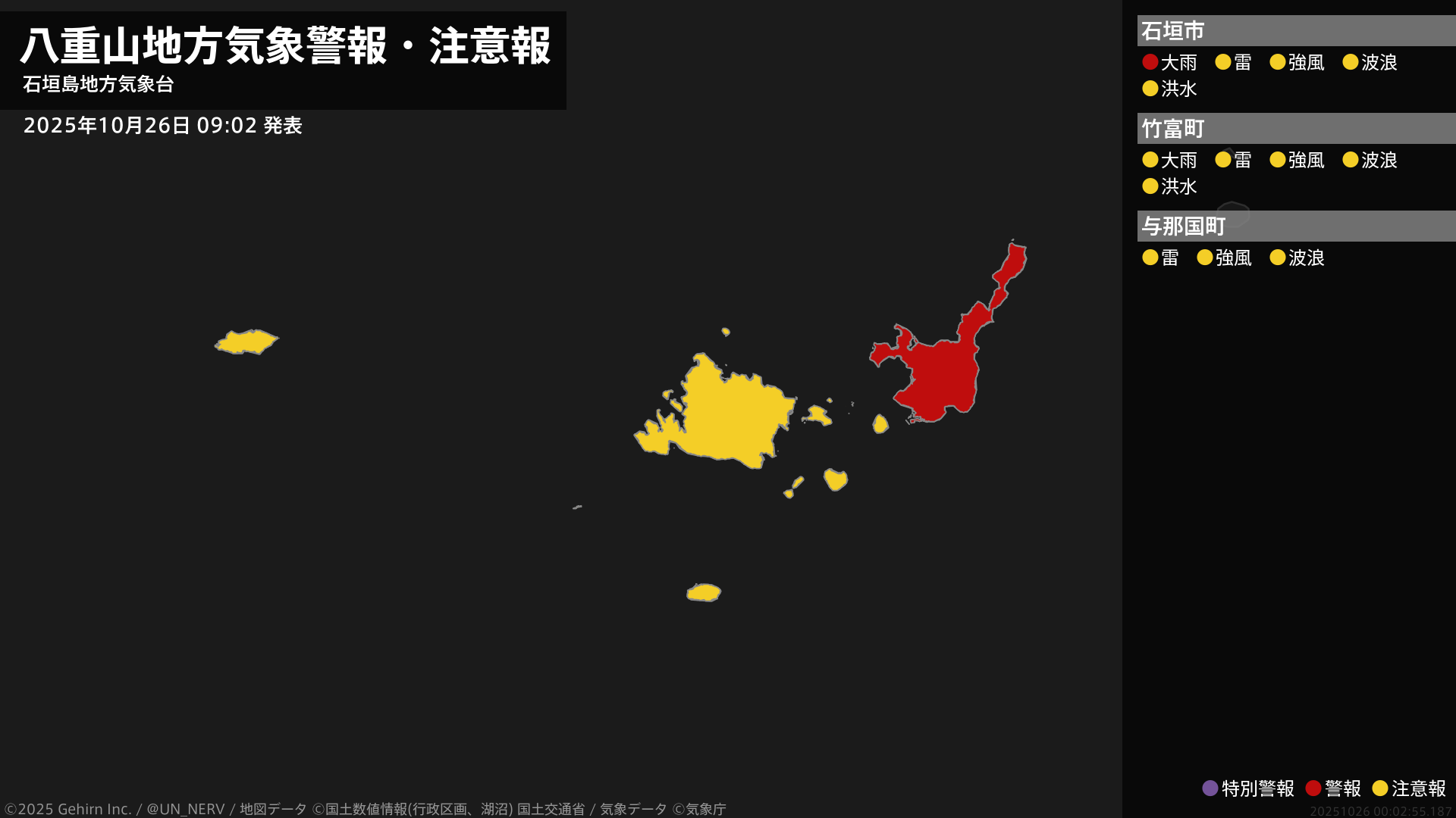 【八重山地方 気象警報・注意報 2025年10月26日 09:02】石垣島地方では、26日夕方まで土砂災害や低い土地の浸水に警戒してください。#気象警報注意報 #八重山地方