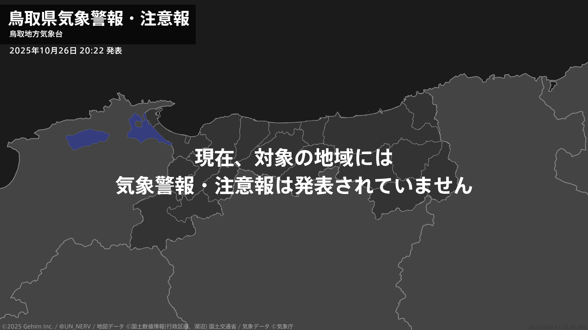 【鳥取県 気象警報・注意報 2025年10月26日 20:22】注意報を解除します。#気象警報注意報 #鳥取県