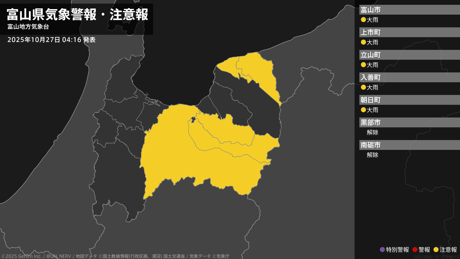 【富山県 気象警報・注意報 2025年10月27日 04:16】東部では、27日夜遅くまで土砂災害に注意してください。#気象警報注意報 #富山県