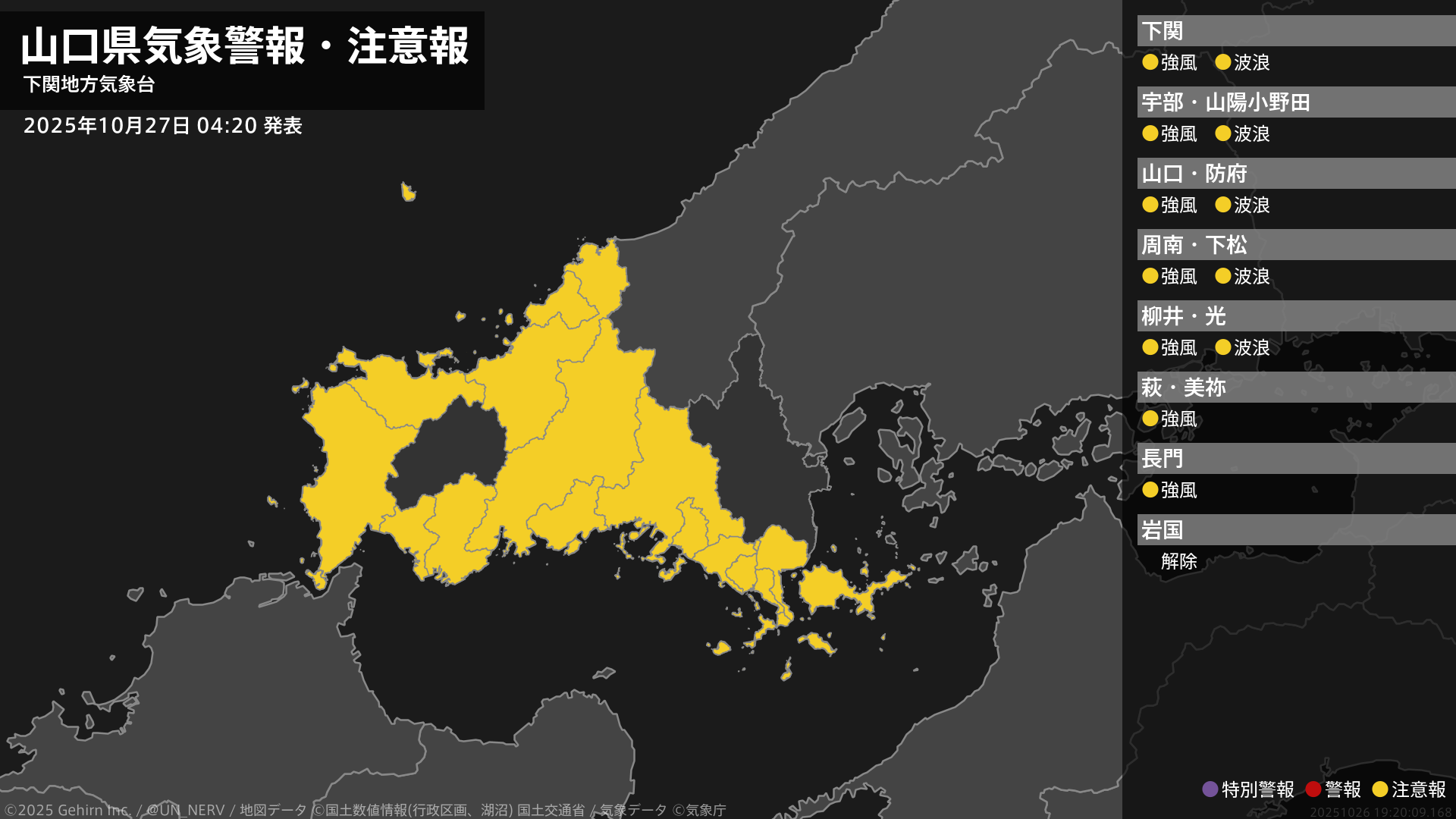 【山口県 気象警報・注意報 2025年10月27日 04:20】