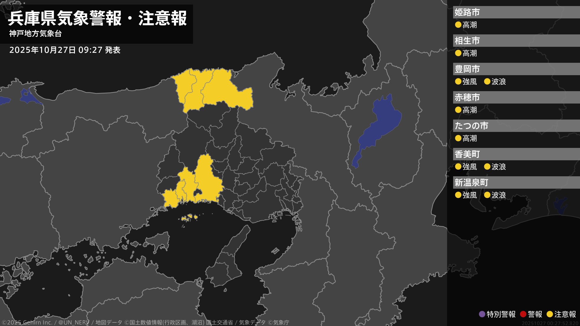 【兵庫県 気象警報・注意報 2025年10月27日 09:27】