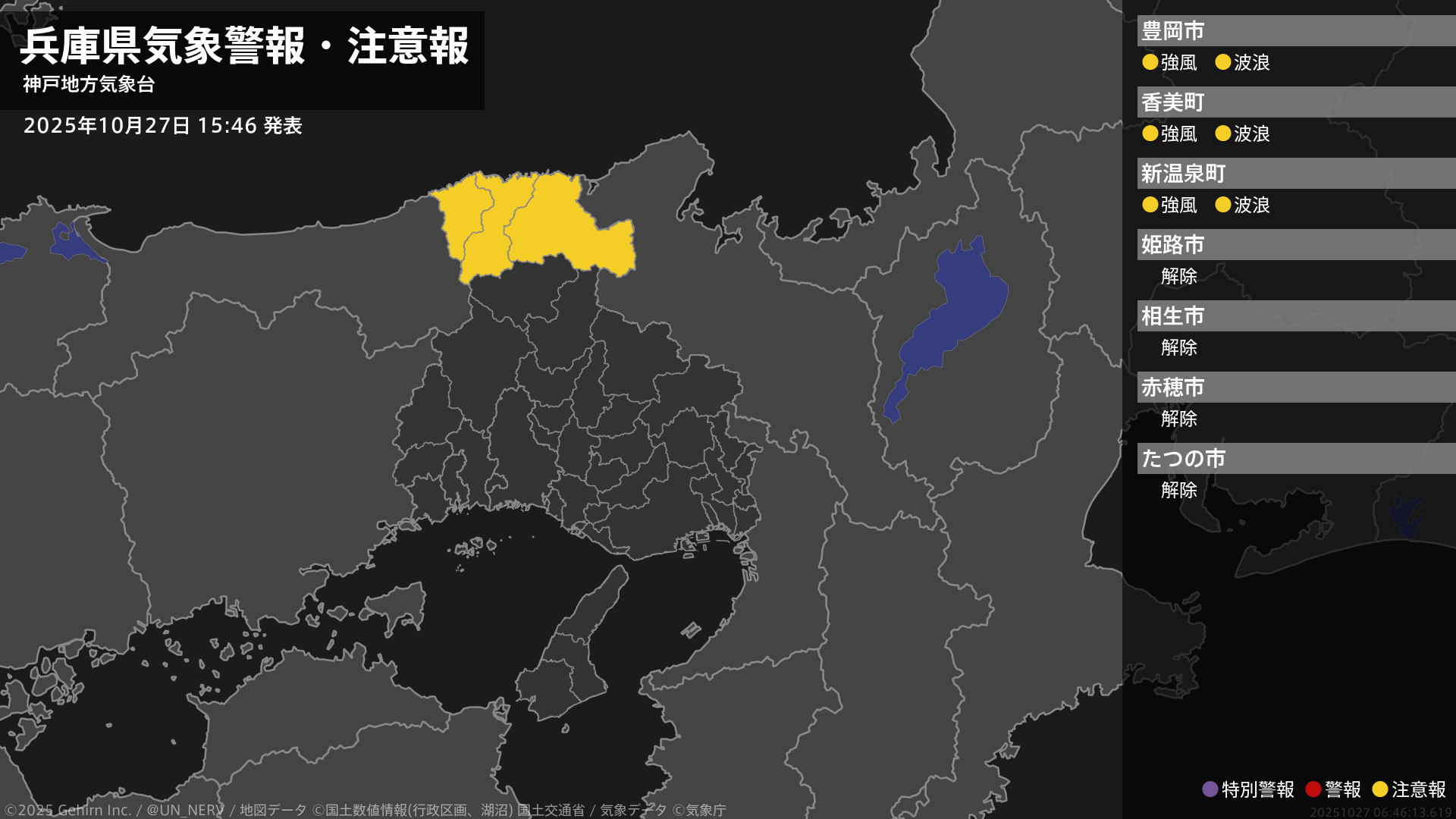 【兵庫県 気象警報・注意報 2025年10月27日 15:46】北部では、27日夜遅くまで強風に、28日夕方まで高波に注意してください。#気象警報注意報 #兵庫県