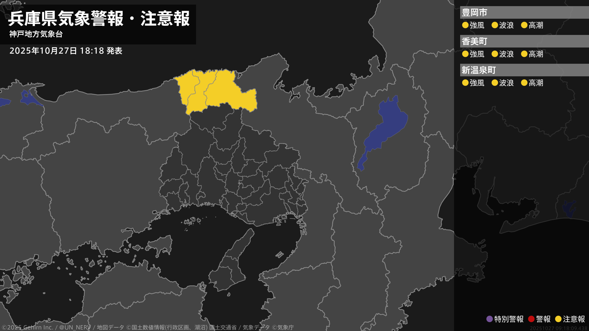 【兵庫県 気象警報・注意報 2025年10月27日 18:18】北部では、27日夜遅くまで強風に、28日夕方まで高波に、28日未明から28日明け方まで高潮に注意してください。#気象警報注意報 #兵庫県