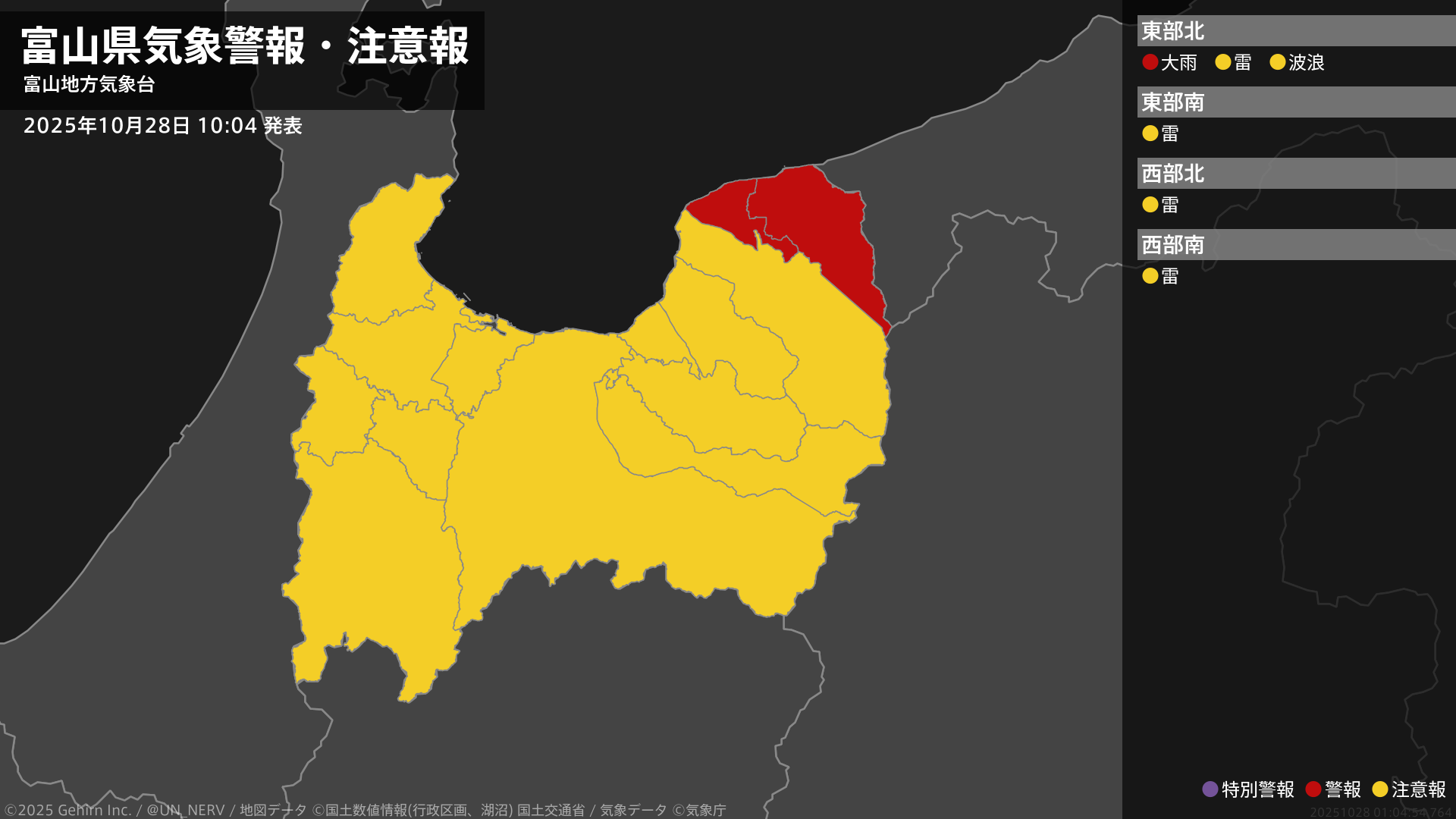 【富山県 気象警報・注意報 2025年10月28日 10:04】東部では、28日夕方まで土砂災害に警戒してください。#気象警報注意報 #富山県