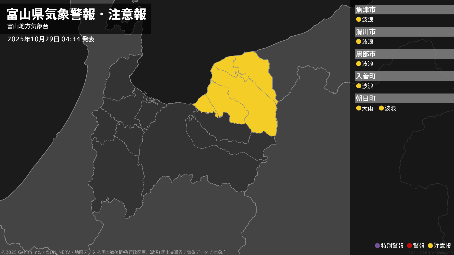 【富山県 気象警報・注意報 2025年10月29日 04:16】東部では、29日昼過ぎまで高波に注意してください。#気象警報注意報 #富山県