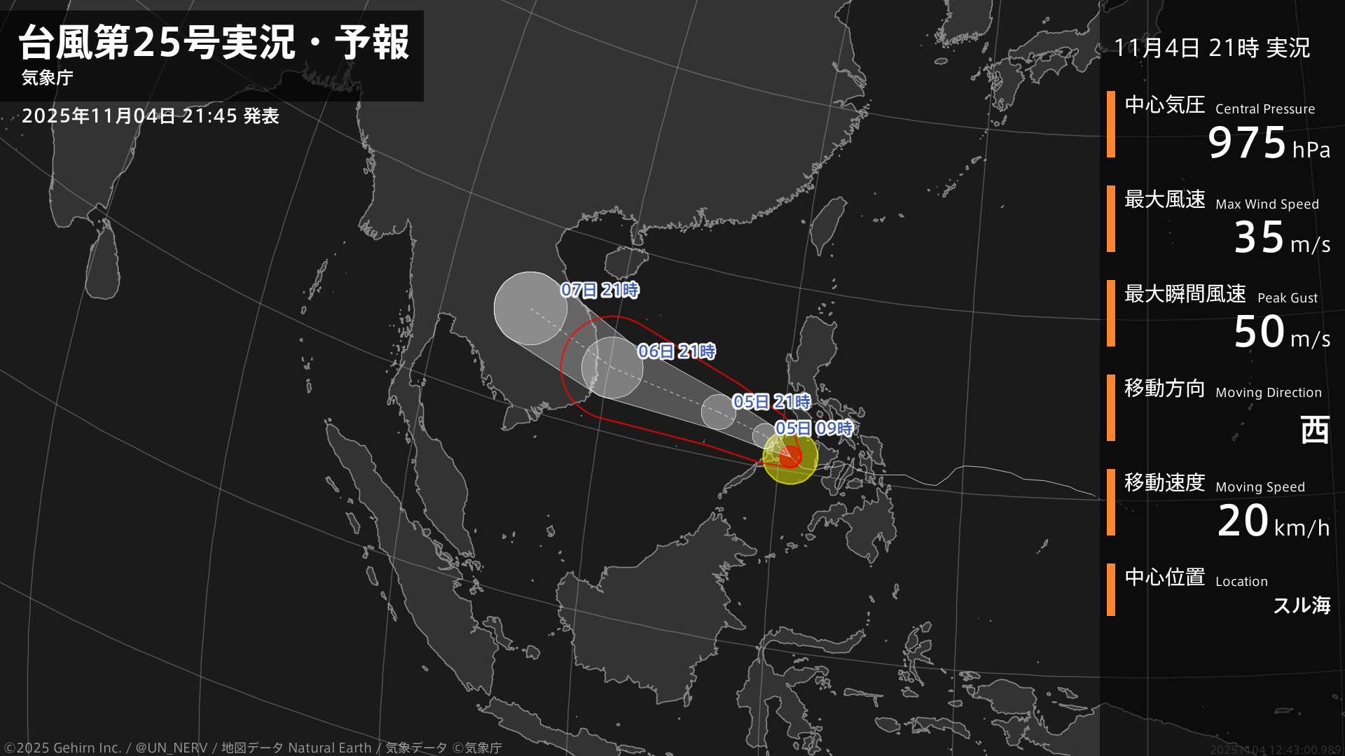 【台風第25号実況・予報 2025年11月04日 21:43】強い台風第25号(カルマエギ)は、スル海を1時間に20キロの速さで西に進んでいます。#台風情報