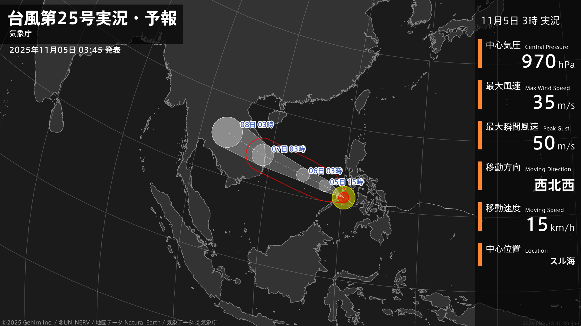 【台風第25号実況・予報 2025年11月05日 03:40】強い台風第25号(カルマエギ)は、スル海を1時間に15キロの速さで西北西に進んでいます。#台風情報