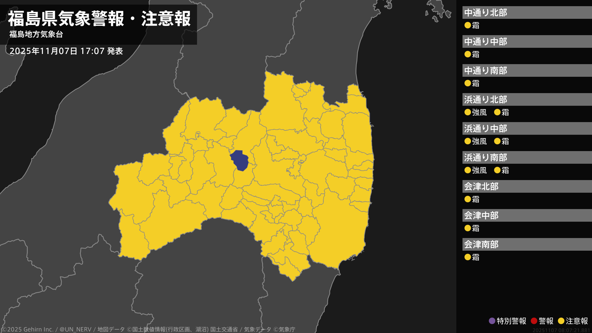 【福島県 気象警報・注意報 2025年11月07日 17:07】浜通りでは、7日夜のはじめ頃まで強風に注意してください。福島県では、8日朝は霜に対する農作物の管理に注意してください。#気象警報注意報 #福島県