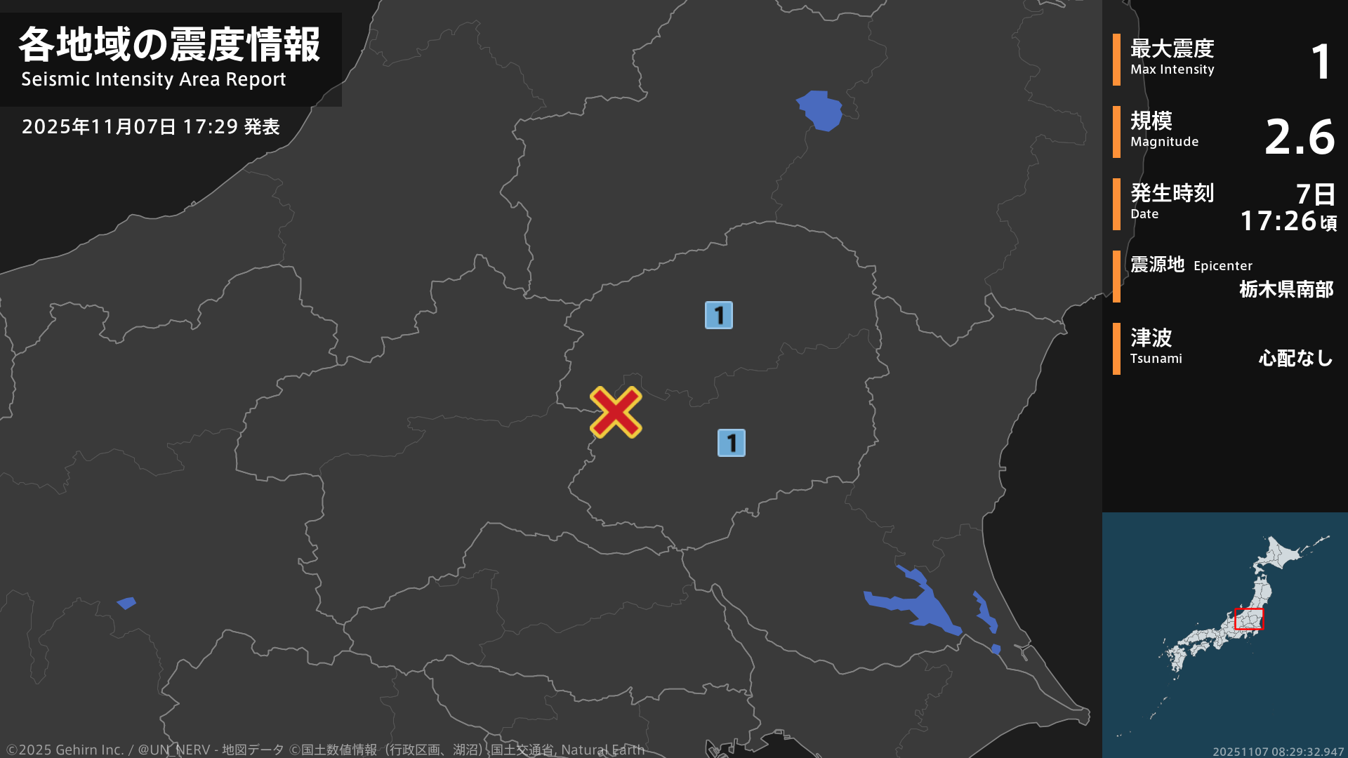 【地震情報 2025年11月7日】17時26分頃、栃木県南部を震源とする地震がありました。震源の深さは約10km、地震の規模はM2.6、最大震度1を栃木県で観測しています。この地震による津波の心配はありません。#地震 #栃木県