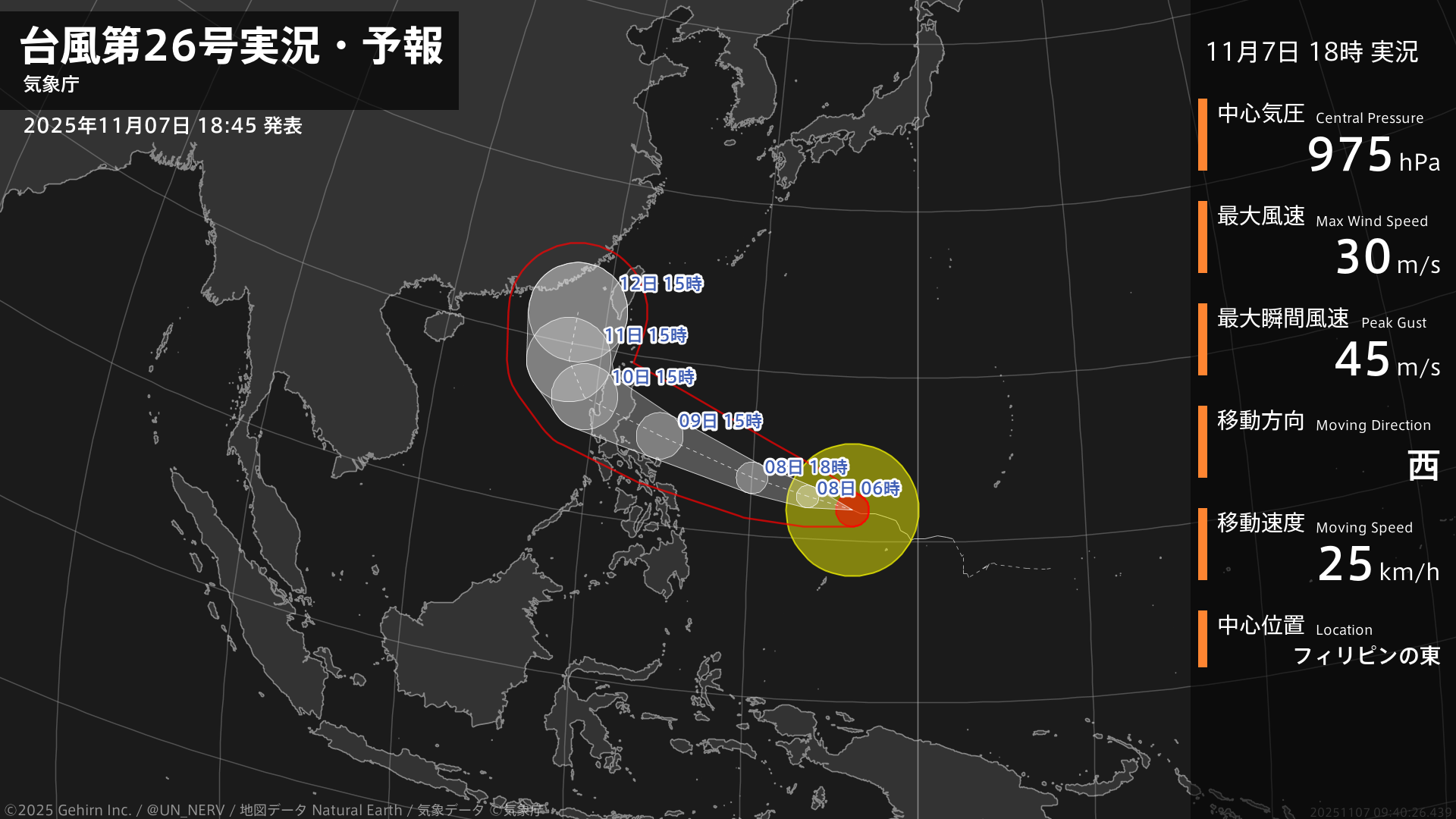 【台風第26号実況・予報 2025年11月07日 18:40】台風第26号(フォンウォン)は、フィリピンの東を1時間に25キロの速さで西に進んでいます。#台風情報