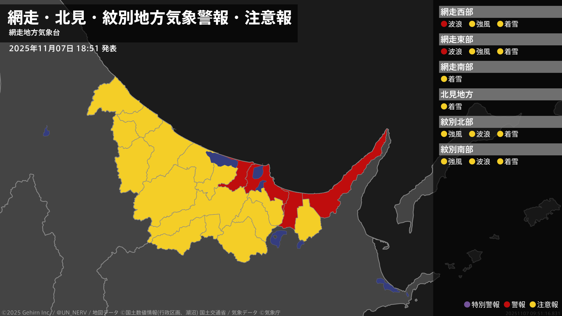 【網走・北見・紋別地方 気象警報・注意報 2025年11月07日 18:51】網走地方では、8日昼前まで高波に警戒してください。#気象警報注意報 #網走・北見・紋別地方
