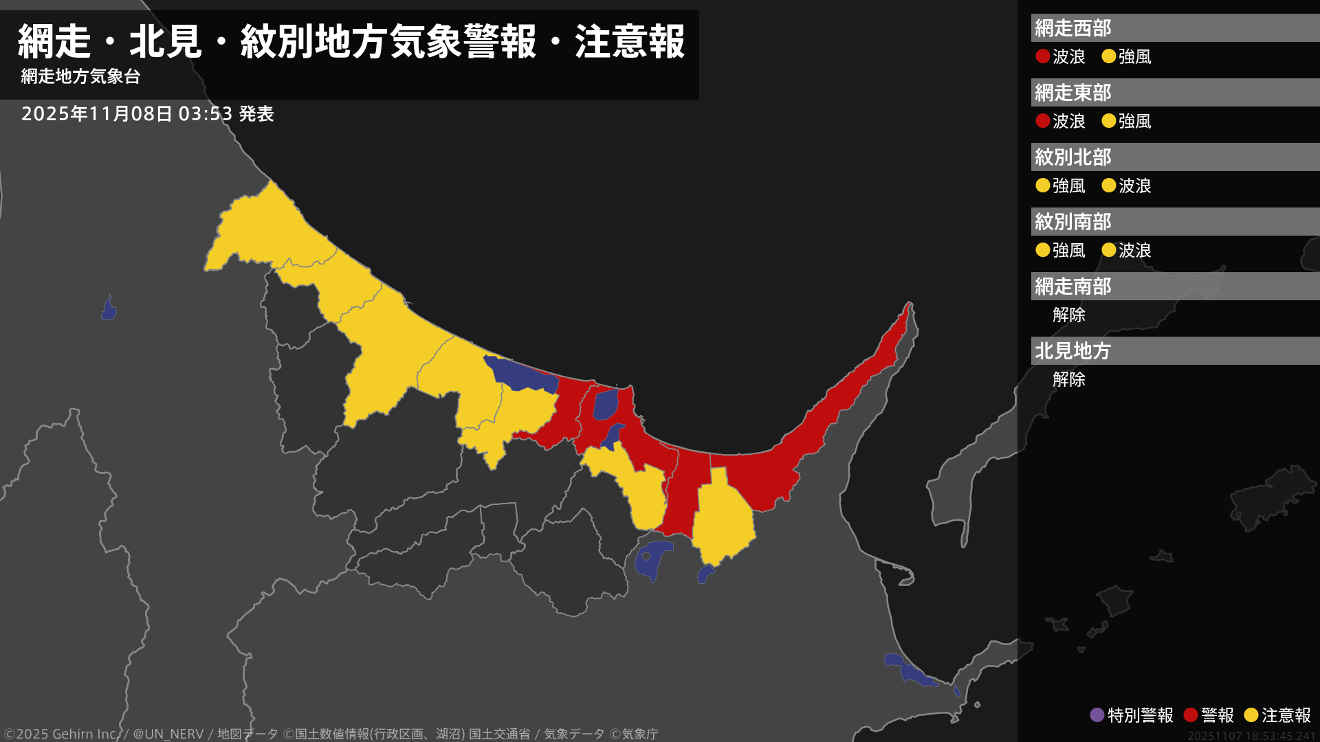 【網走・北見・紋別地方 気象警報・注意報 2025年11月08日 03:53】