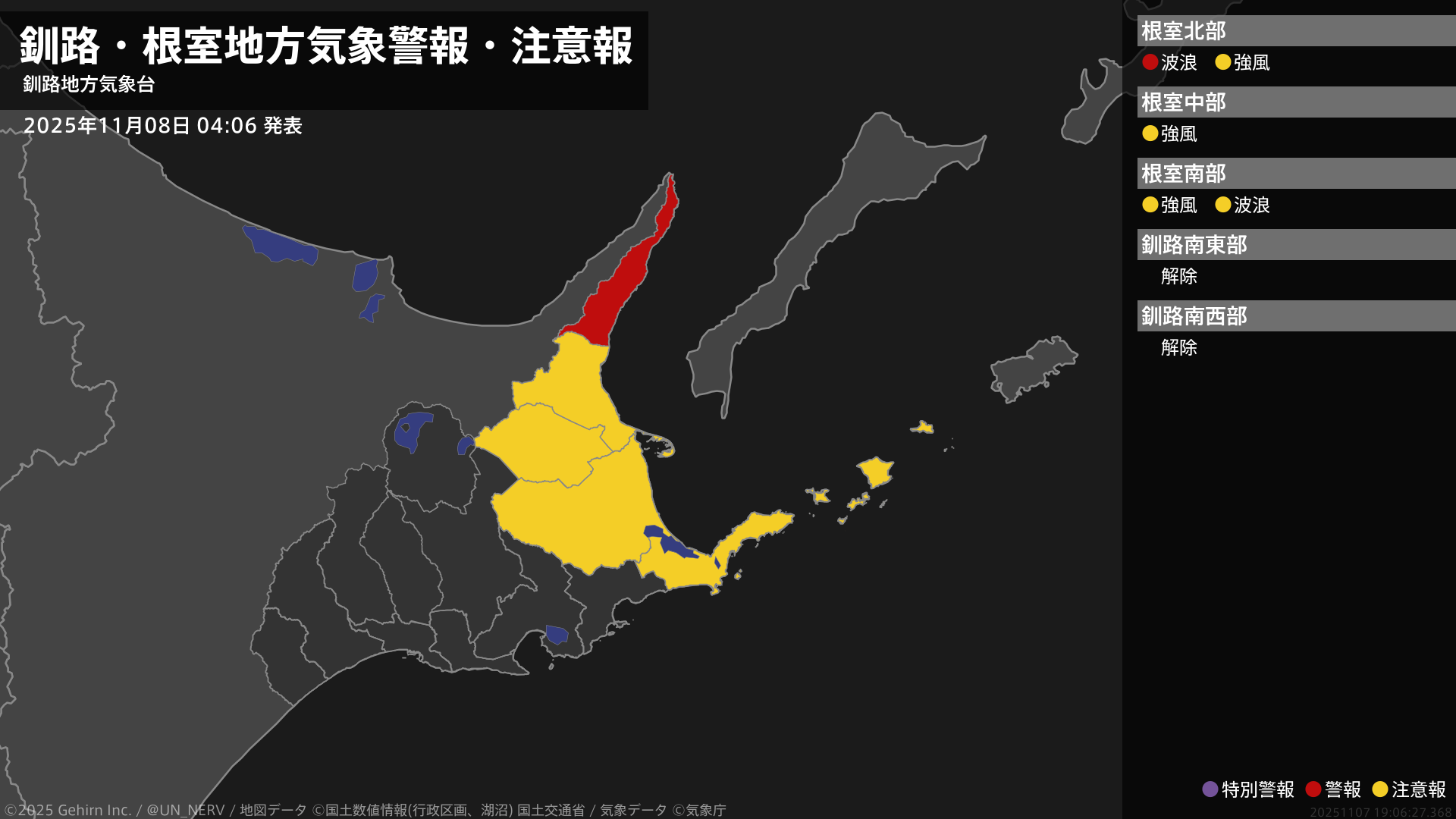 【釧路・根室地方 気象警報・注意報 2025年11月08日 04:06】
