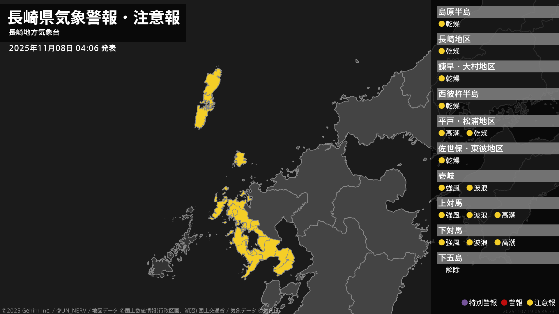 【長崎県 気象警報・注意報 2025年11月08日 04:06】