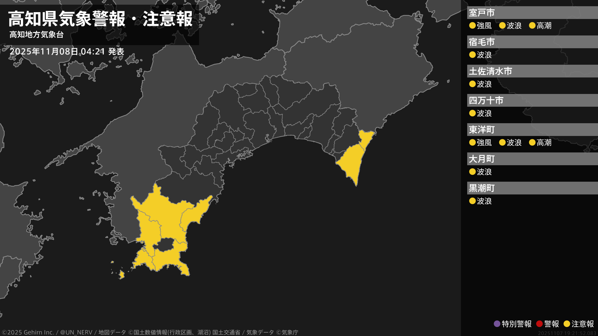 【高知県 気象警報・注意報 2025年11月08日 04:21】東部では、8日昼前まで強風に、8日朝は高潮に注意してください。東部、西部では、8日昼前まで高波に注意してください。#気象警報注意報 #高知県