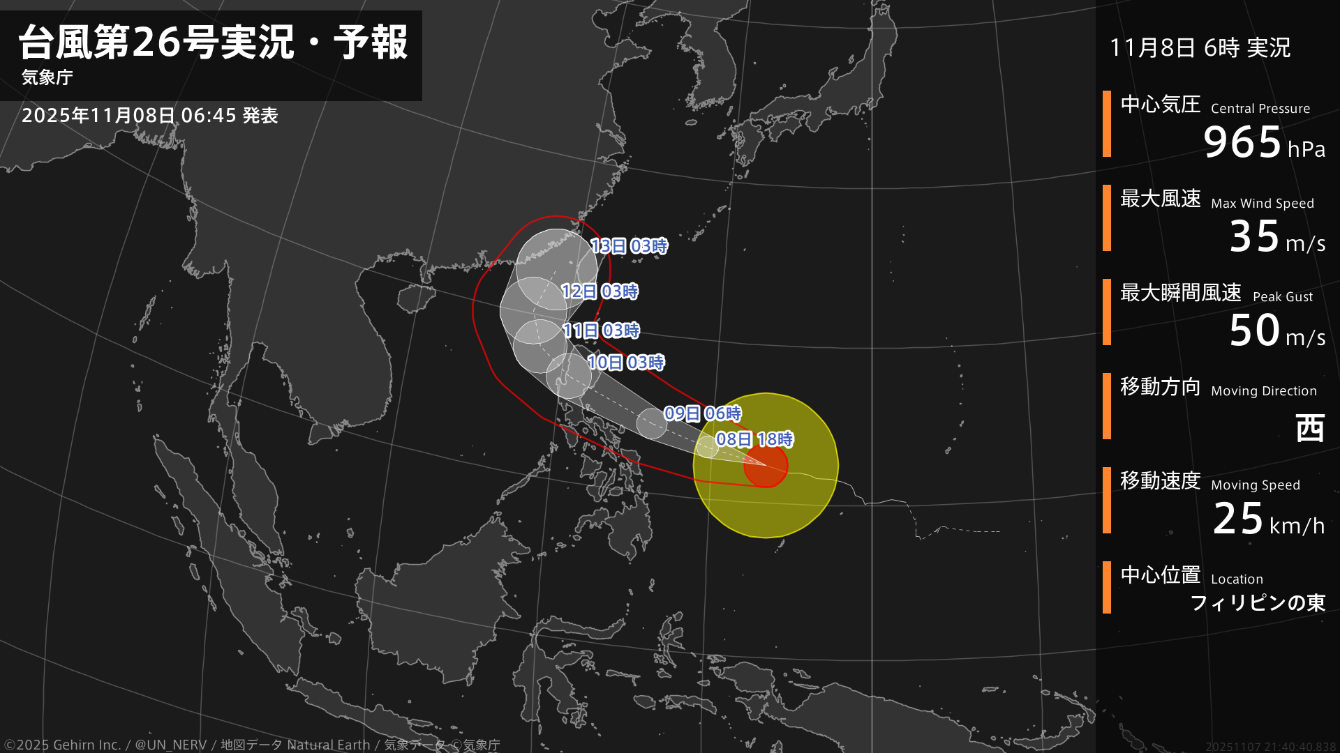 【台風第26号実況・予報 2025年11月08日 06:40】大型で強い台風第26号(フォンウォン)は、フィリピンの東を1時間に25キロの速さで西に進んでいます。#台風情報