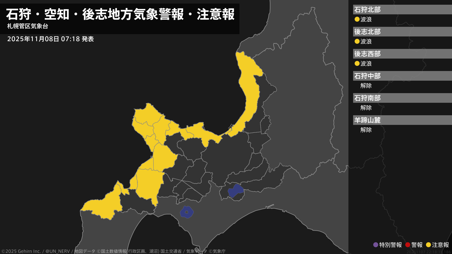 【石狩・空知・後志地方 気象警報・注意報 2025年11月08日 07:18】石狩、後志地方では、8日昼前まで高波に注意してください。#気象警報注意報 #石狩地方 #後志地方