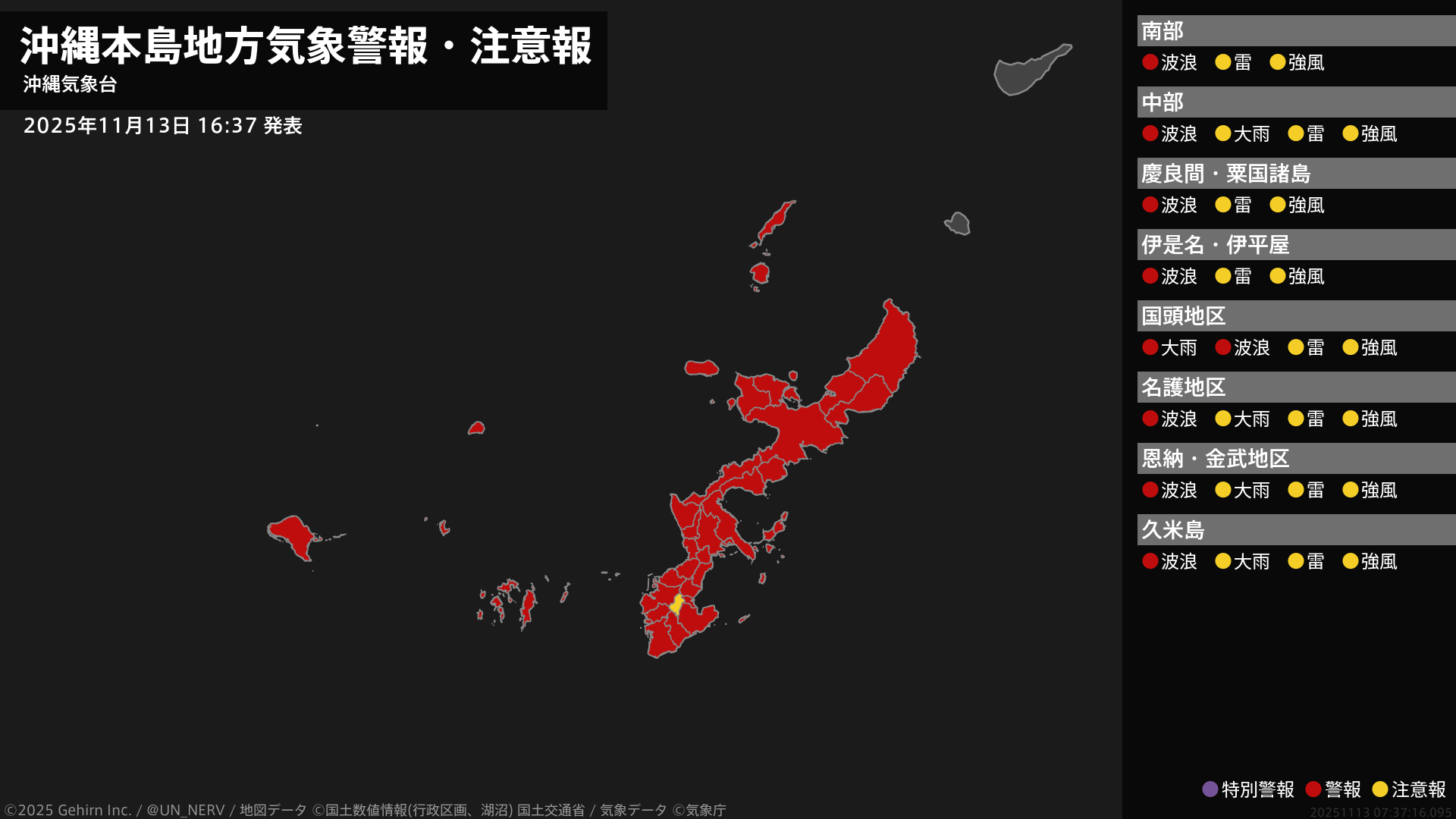 沖縄地方では14日にかけて、土砂災害に厳重に警戒し、低い土地の浸水、河川の増水や氾濫に警戒してください。沖縄本島地方では、13日夜遅くから14日未明にかけて線状降水帯が発生して大雨災害発生の危険度が急激に高まる可能性があります。また、沖縄地方では14日にかけてうねりを伴う高波に警戒し、強風に注意・警戒してください。奄美地方では14日にかけて土砂災害に警戒してください。