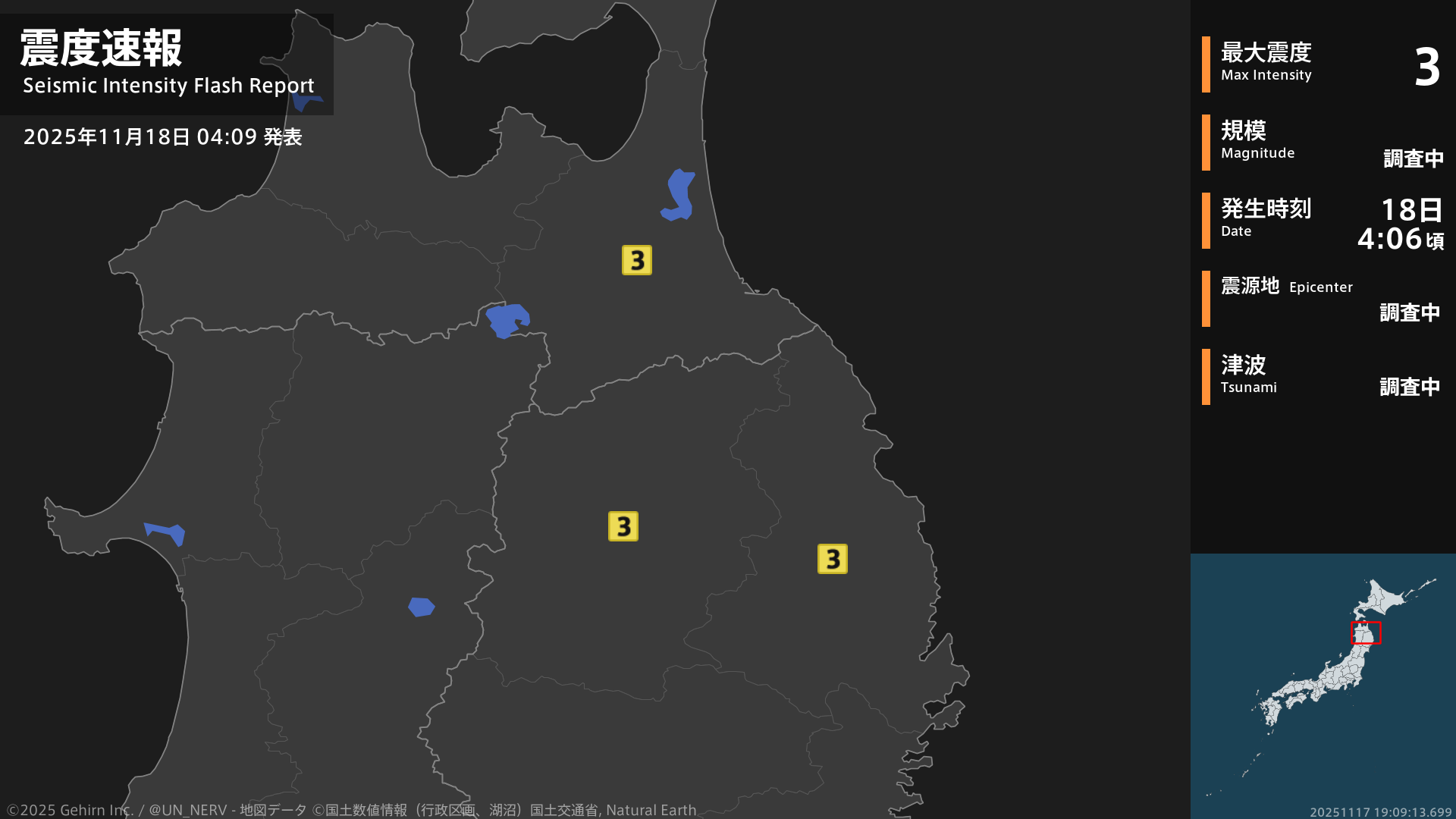 【地震 04:06】[震度3]青森三八上北、岩手沿岸北部、岩手内陸北部#地震 #青森県 #岩手県