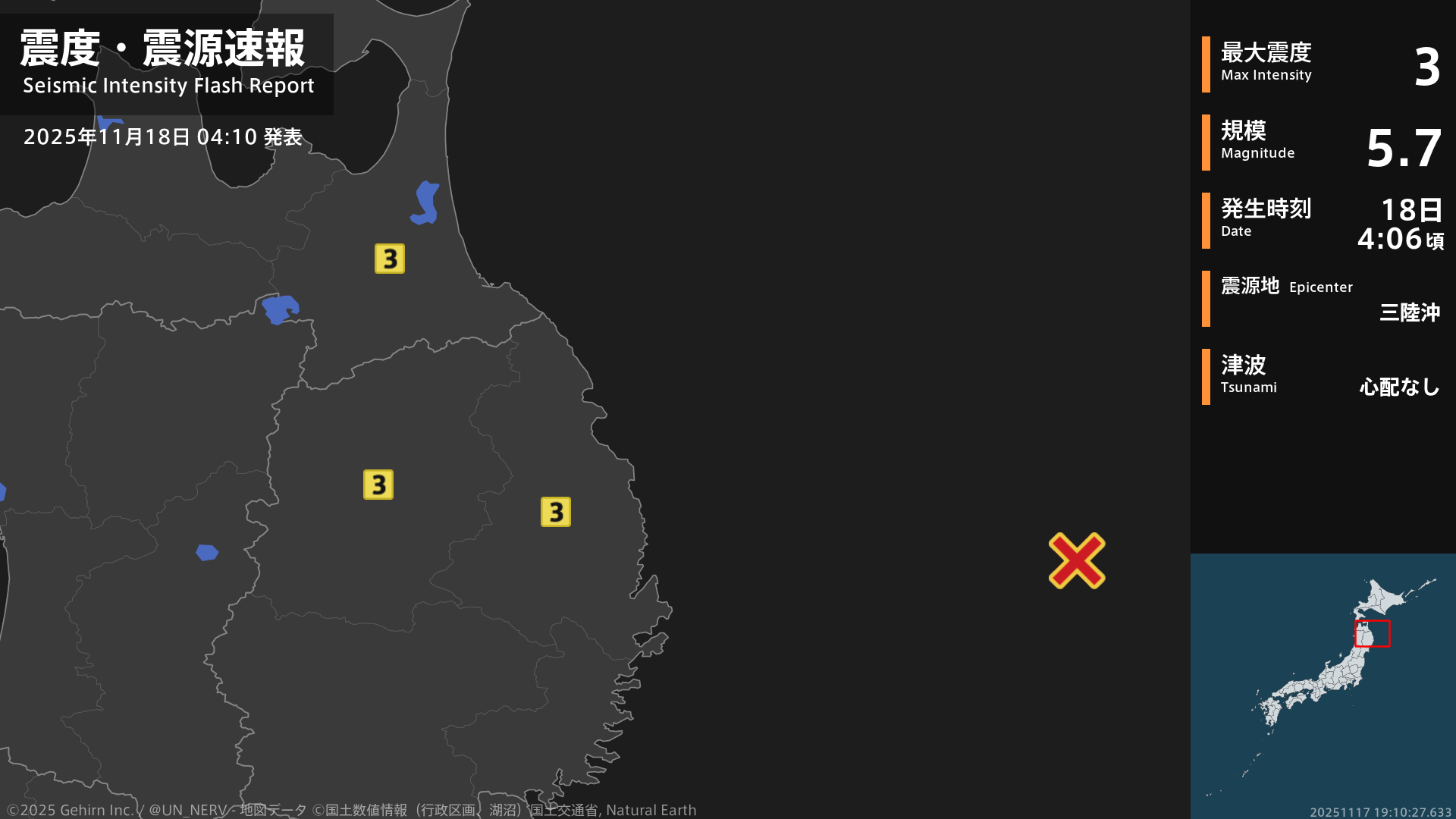【地震情報 2025年11月18日】4時6分頃、三陸沖を震源とする地震がありました。震源の深さは約10km、地震の規模はM5.7、最大震度3を青森県、岩手県で観測しています。この地震による津波の心配はありません。#地震 #青森県 #岩手県 #北海道 #宮城県 #秋田県 #山形県