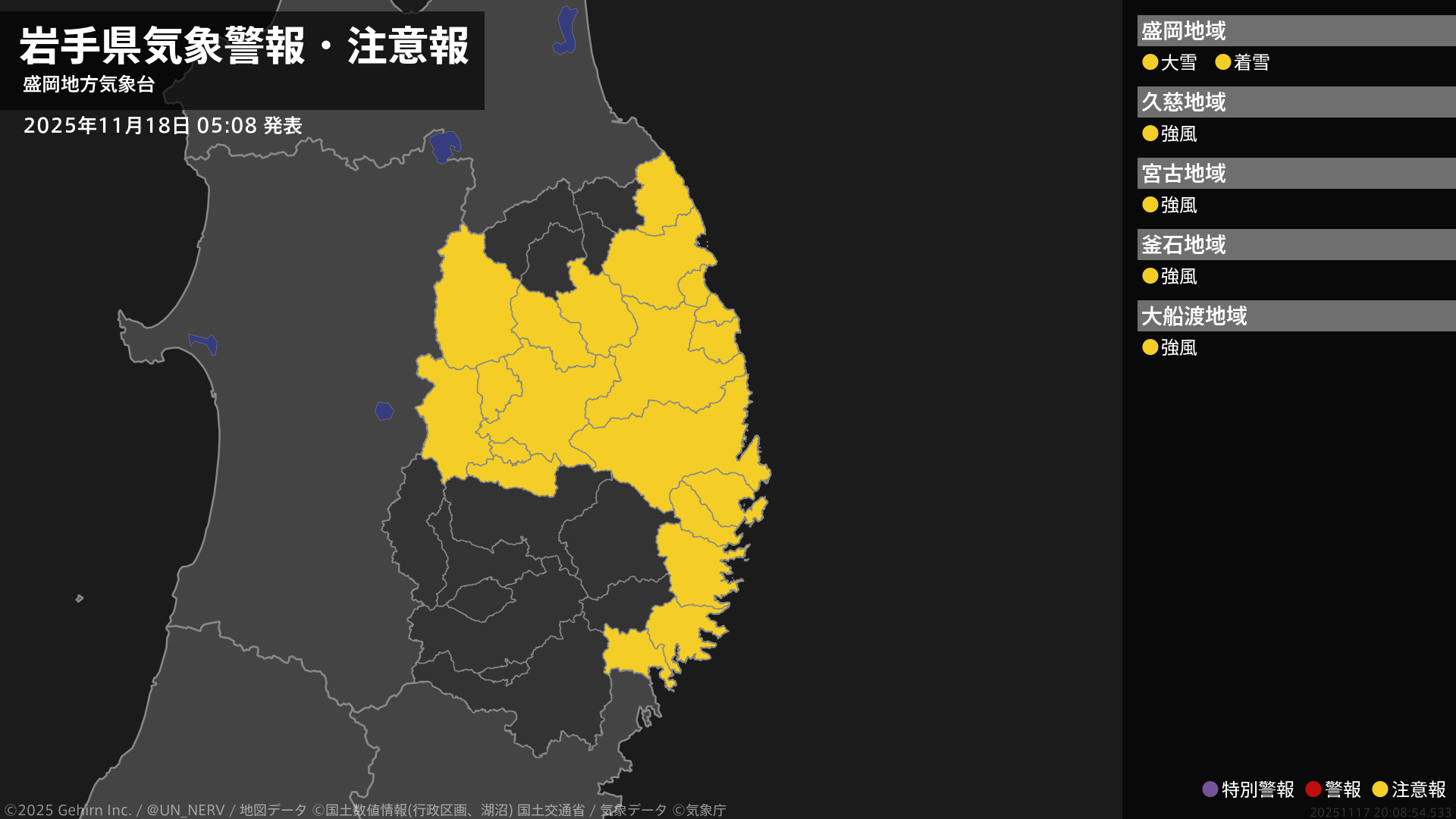 【岩手県 気象警報・注意報 2025年11月18日 05:08】沿岸北部、沿岸南部では、18日昼前まで強風に注意してください。内陸では、18日夕方まで大雪や電線等への着雪に注意してください。#気象警報注意報 #岩手県