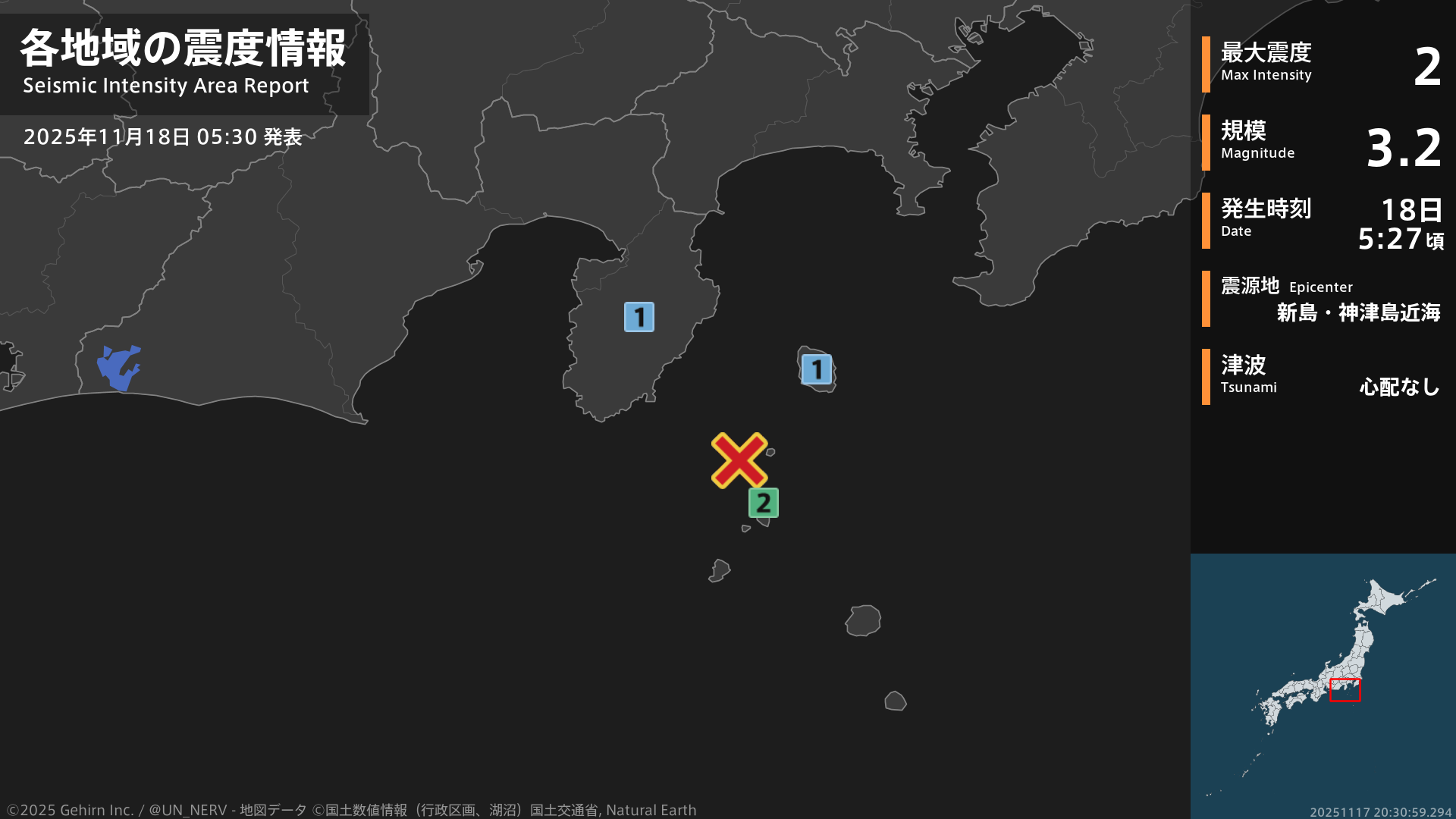 【地震情報 2025年11月18日】5時27分頃、新島・神津島近海を震源とする地震がありました。震源の深さは約10km、地震の規模はM3.2、最大震度2を東京都で観測しています。この地震による津波の心配はありません。#地震 #東京都 #静岡県