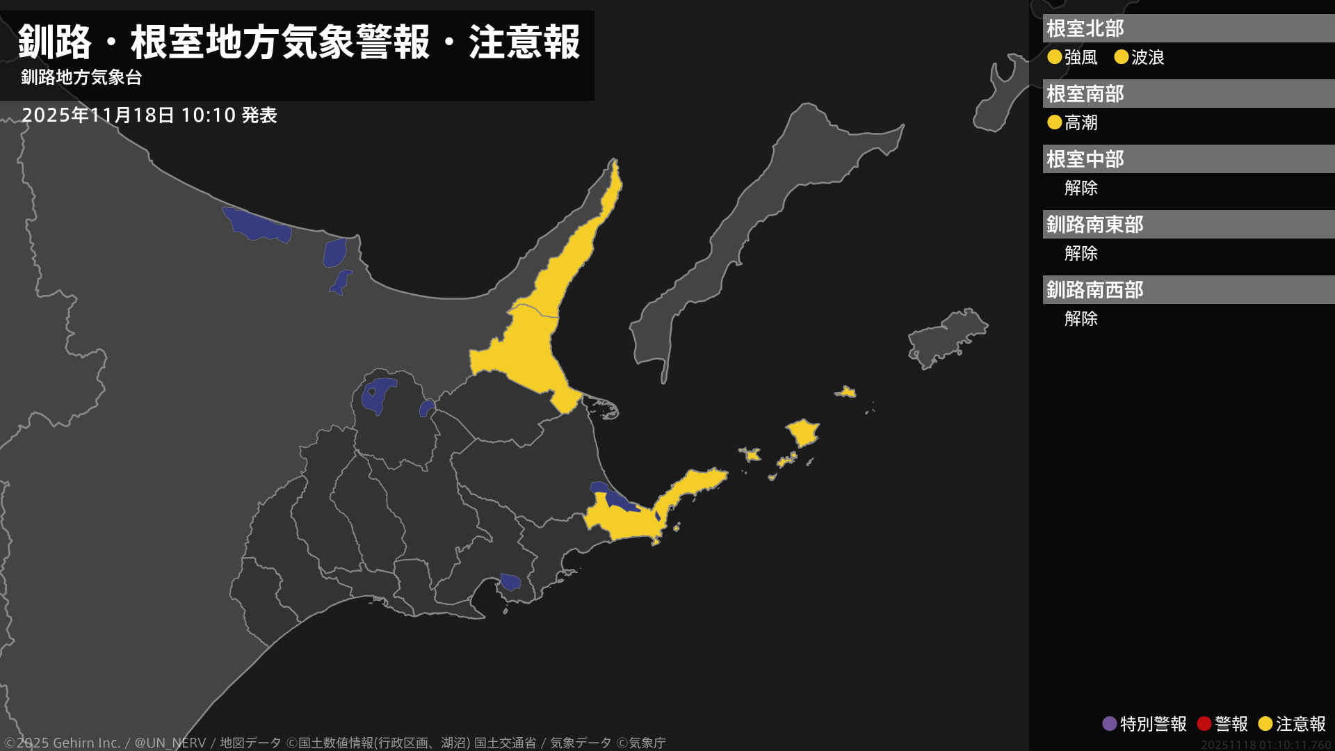 【釧路・根室地方 気象警報・注意報 2025年11月18日 10:10】根室地方では、強風や高波、高潮に注意してください。#気象警報注意報 #根室地方 #釧路地方