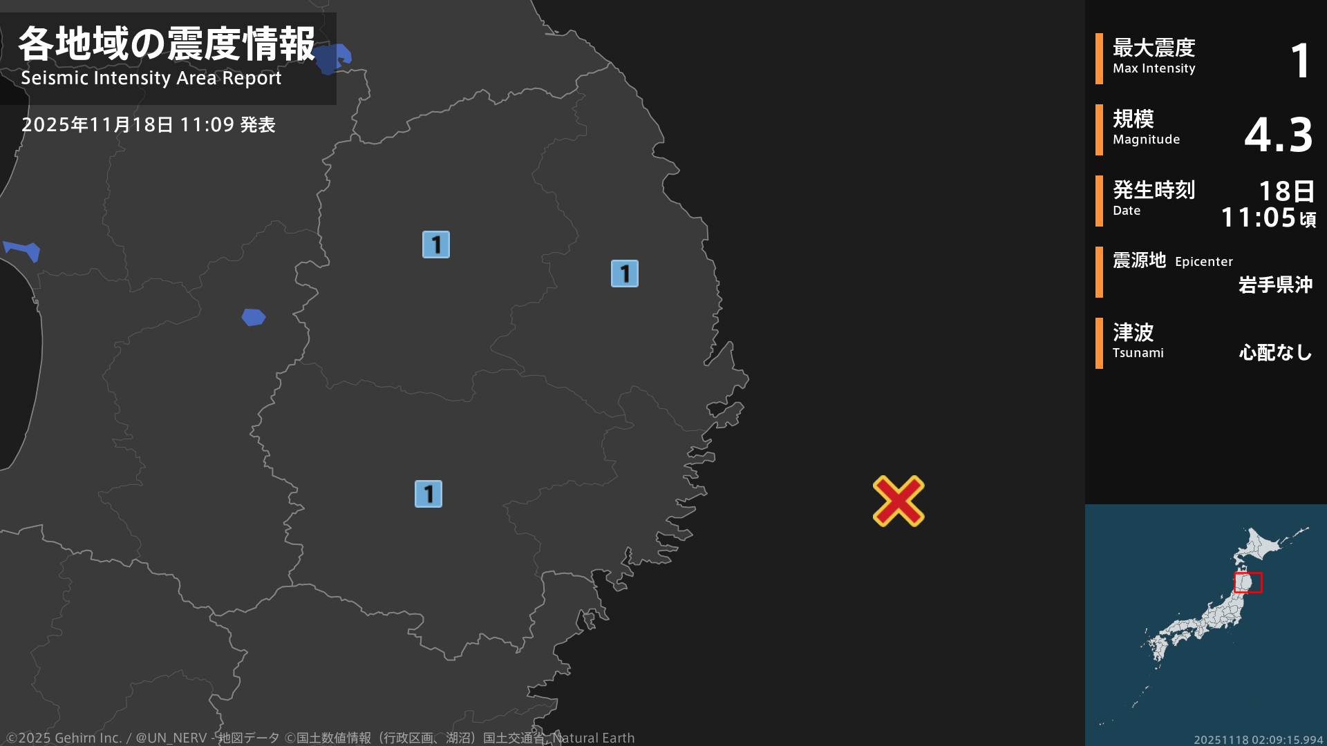 【地震情報 2025年11月18日】11時5分頃、岩手県沖を震源とする地震がありました。震源の深さは約30km、地震の規模はM4.3、最大震度1を岩手県で観測しています。この地震による津波の心配はありません。#地震 #岩手県