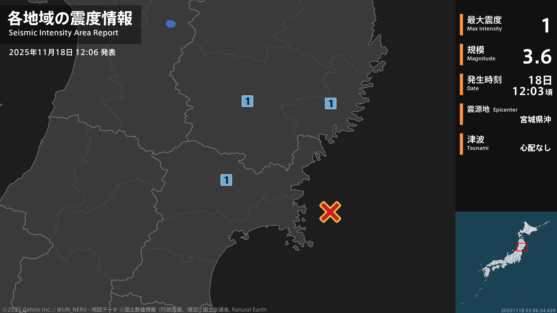【地震情報 2025年11月18日】12時3分頃、宮城県沖を震源とする地震がありました。震源の深さは約60km、地震の規模はM3.6、最大震度1を岩手県、宮城県で観測しています。この地震による津波の心配はありません。#地震 #岩手県 #宮城県