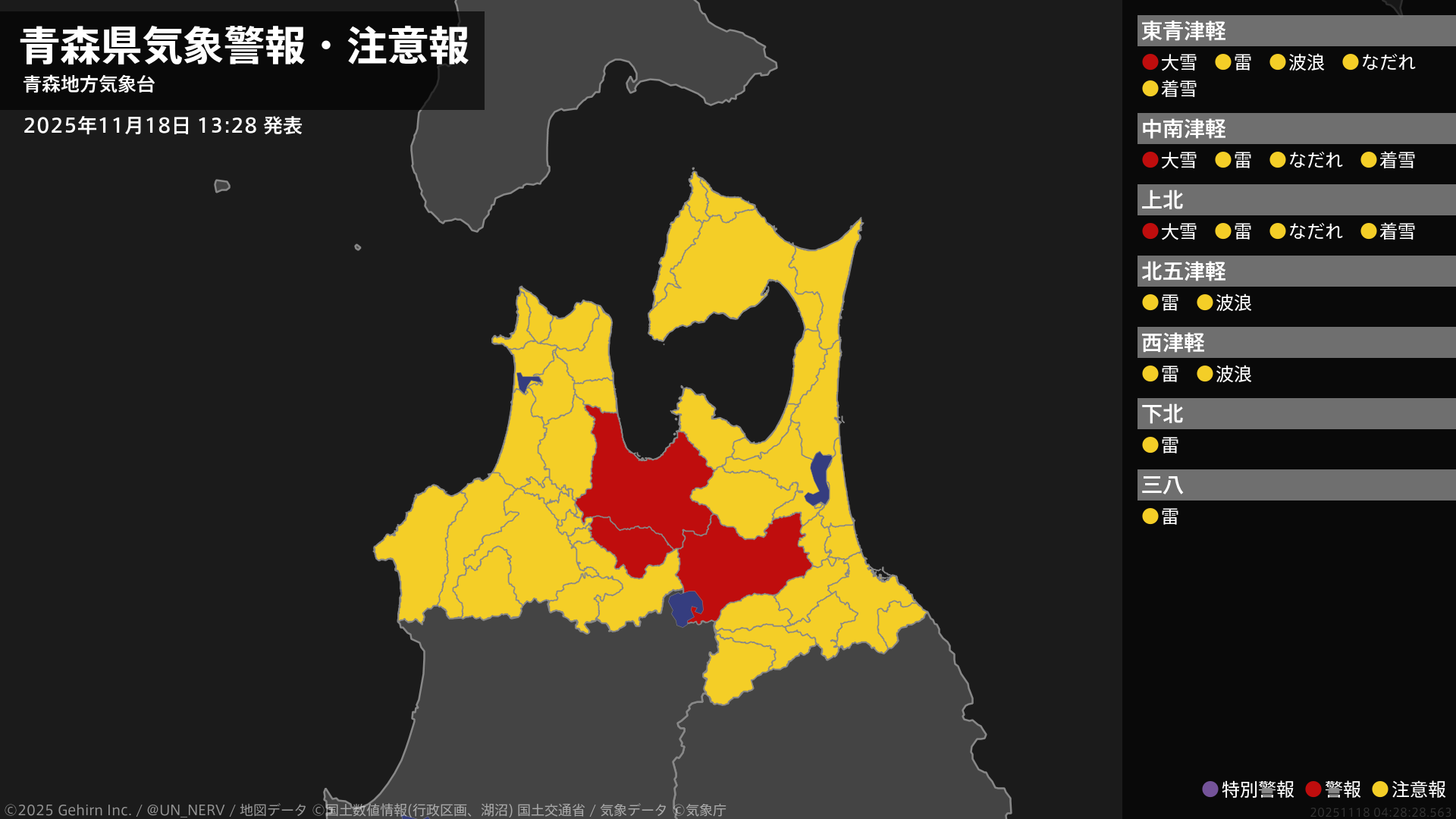 【青森県 気象警報・注意報 2025年11月18日 13:28】津軽、三八上北では、18日夕方まで大雪に警戒してください。#気象警報注意報 #青森県