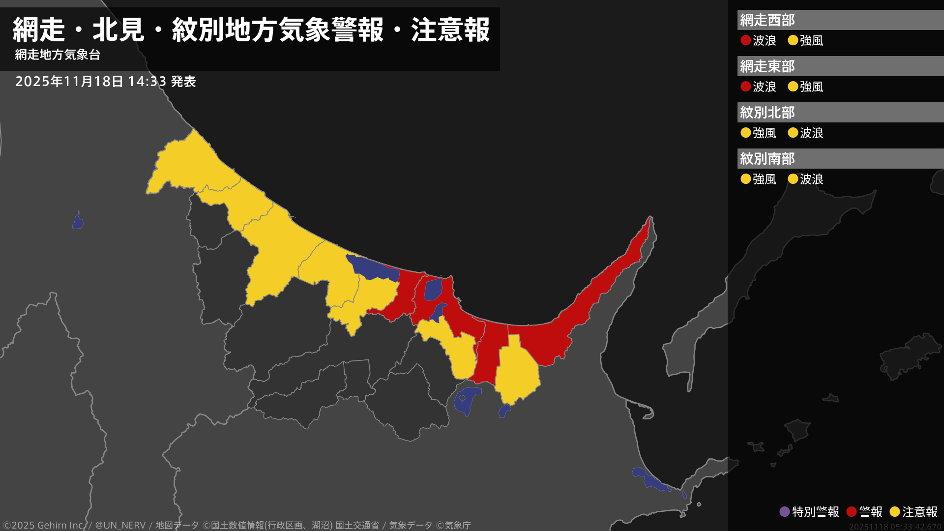 【網走・北見・紋別地方 気象警報・注意報 2025年11月18日 14:33】網走地方では、18日夕方から19日明け方まで高波に警戒してください。#気象警報注意報 #網走・北見・紋別地方