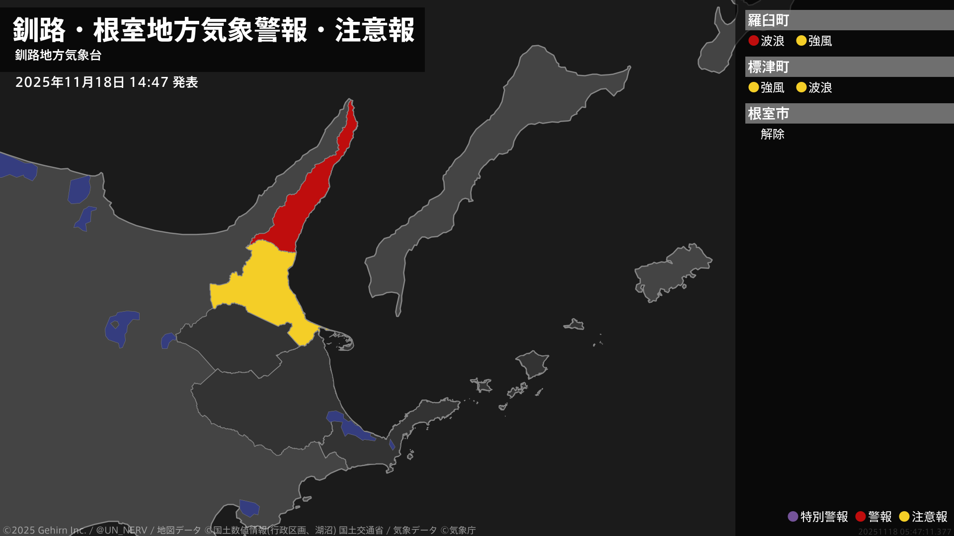 【釧路・根室地方 気象警報・注意報 2025年11月18日 14:47】根室地方では、18日夕方から19日明け方まで高波に警戒してください。#気象警報注意報 #根室地方