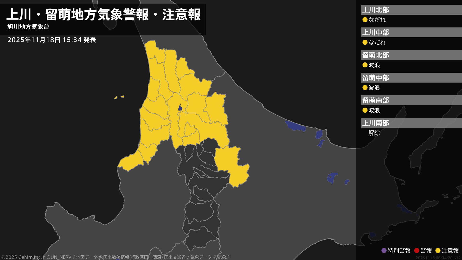 【上川・留萌地方 気象警報・注意報 2025年11月18日 15:34】留萌地方では、18日夜遅くまで高波に注意してください。上川地方では、19日までなだれに注意してください。#気象警報注意報 #上川地方 #留萌地方