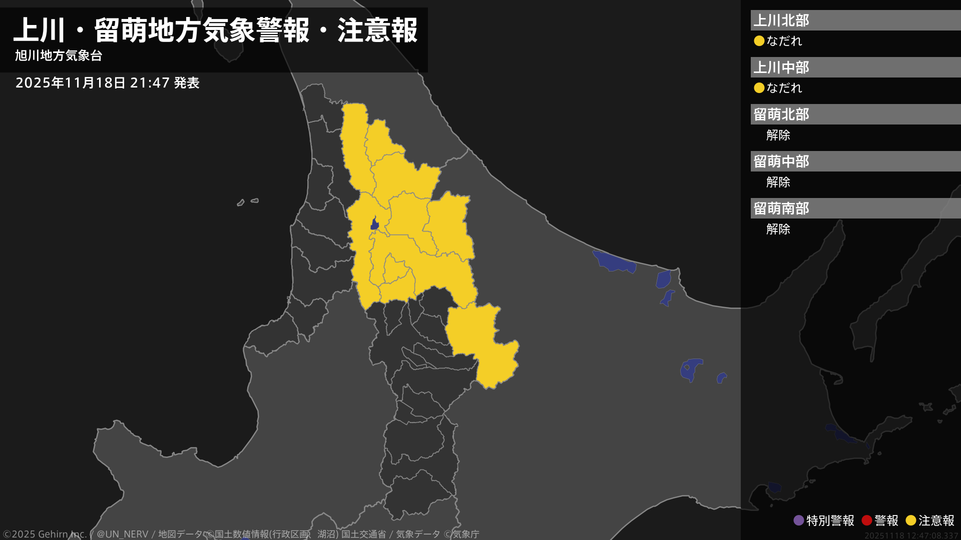 【上川・留萌地方 気象警報・注意報 2025年11月18日 21:47】上川地方では、19日までなだれに注意してください。#気象警報注意報 #上川地方 #留萌地方