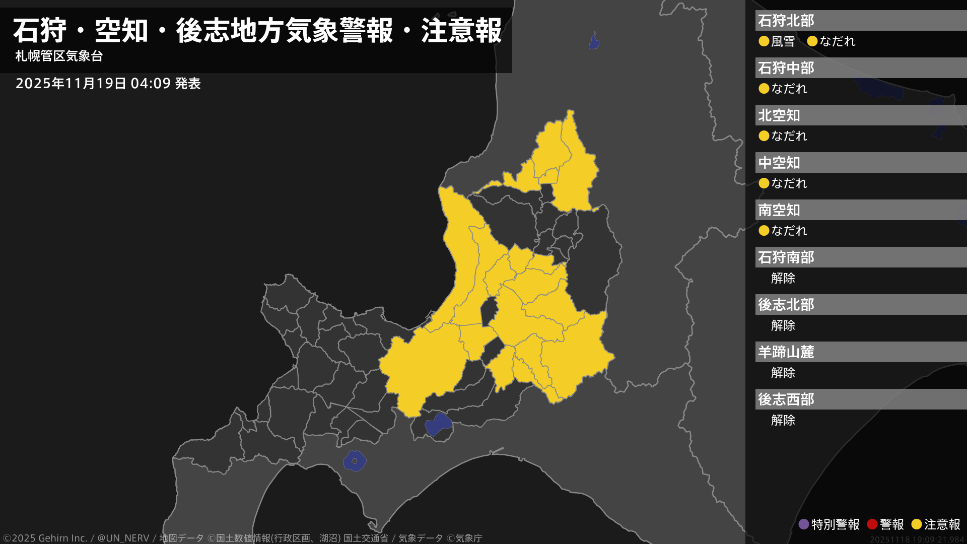 【石狩・空知・後志地方 気象警報・注意報 2025年11月19日 04:09】石狩地方では、19日昼前まで風雪に注意してください。石狩、空知地方では、19日までなだれに注意してください。#気象警報注意報 #石狩地方 #空知地方 #後志地方