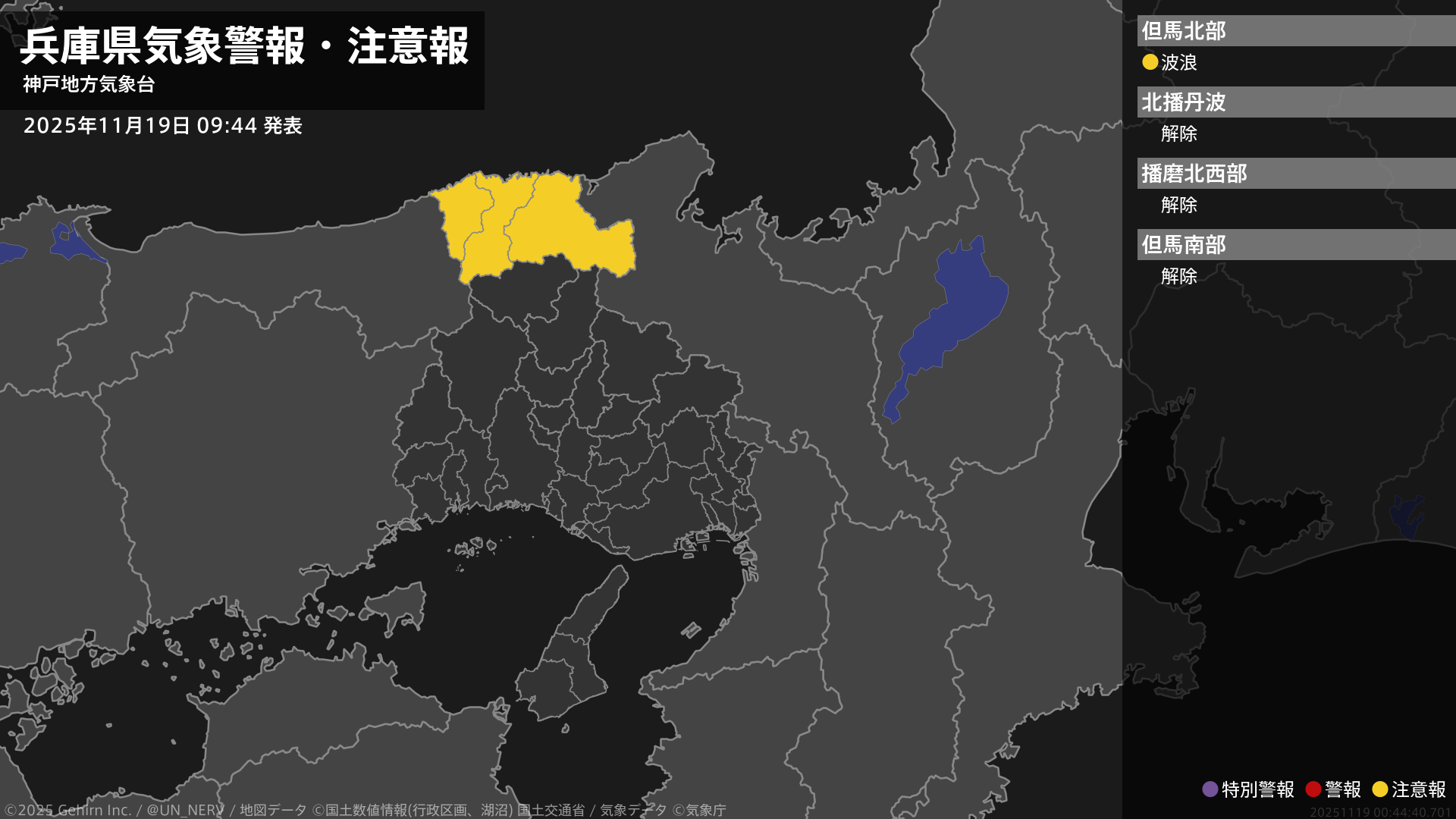 【兵庫県 気象警報・注意報 2025年11月19日 09:44】北部では、19日夕方まで高波に注意してください。#気象警報注意報 #兵庫県